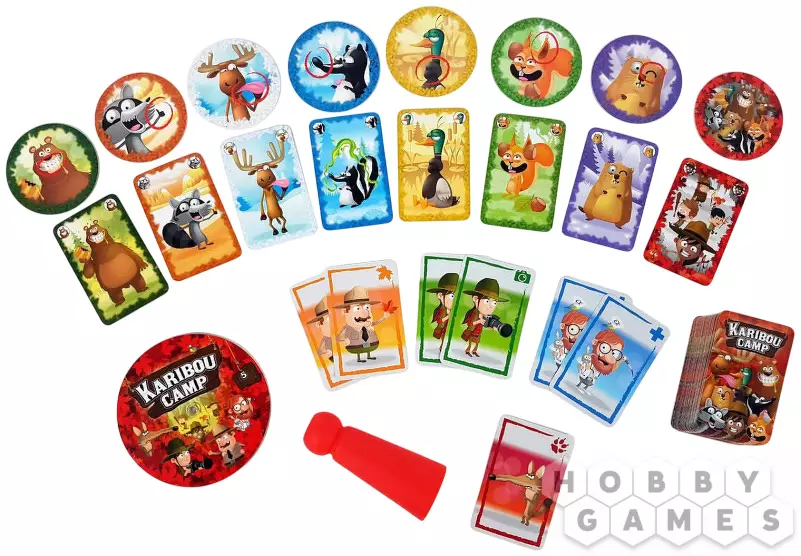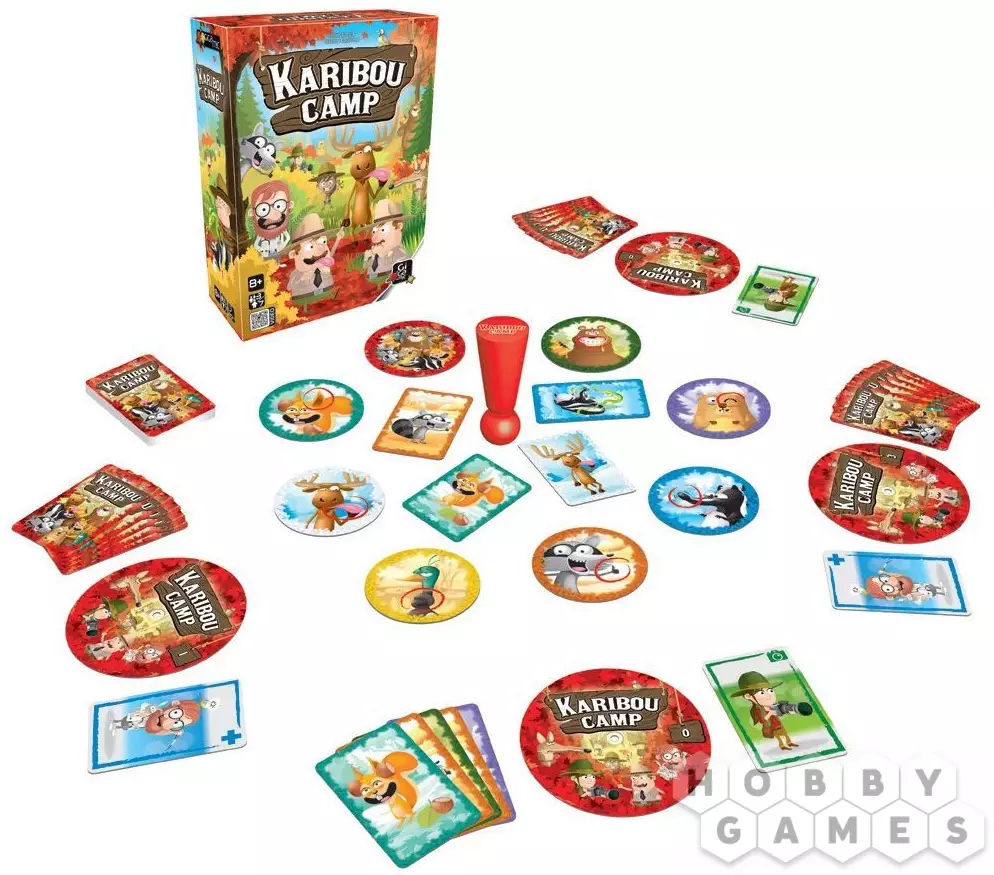 Karibou Camp – это шумная командная игра на внимательность и актёрское мастерство. В начале игры все игроки делятся на команды по два человека в каждой, а если участников нечётное количество, то в битву также вступает одинокий Койот. Теперь дело за малым: каждый раунд вам предстоит одновременно обмениваться картами, стремясь собрать пять одинаковых карт. Как только коллекция готова, нужно незаметно подать партнёру условный сигнал, соответствующий виду животного, – например, подмигнуть, если вы собрали сурков, или высунуть язык, если лосей. Но будьте осторожны – соперники могут заметить подсказку и украсть ваши очки! Побеждает команда, первой набравшая 9 очков.