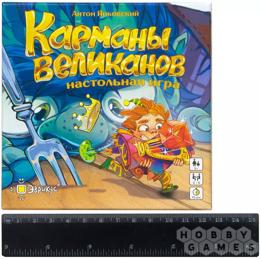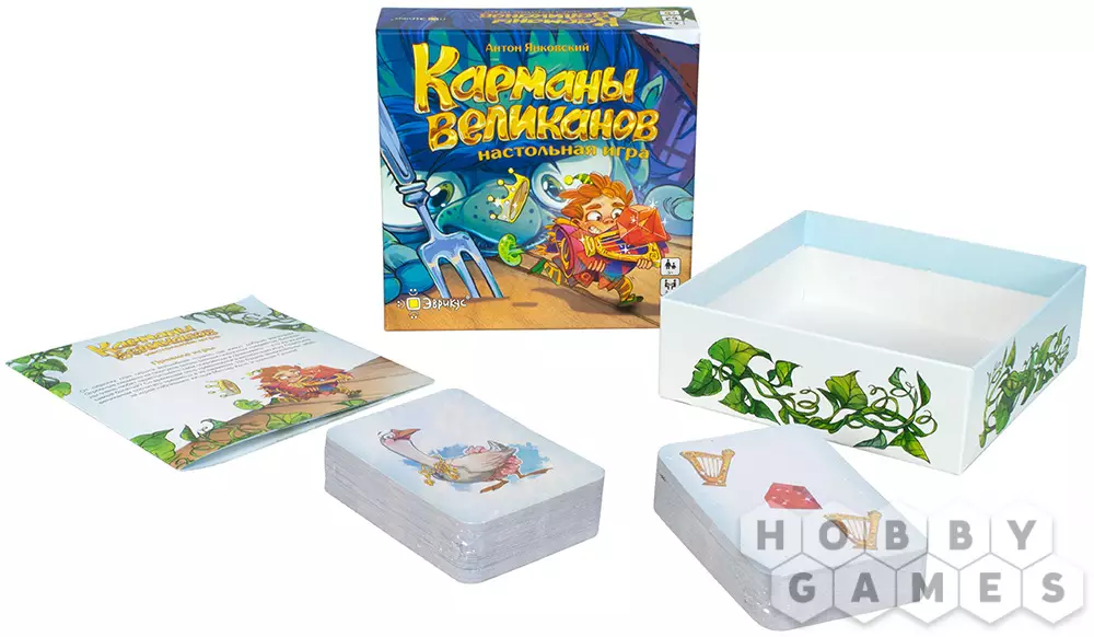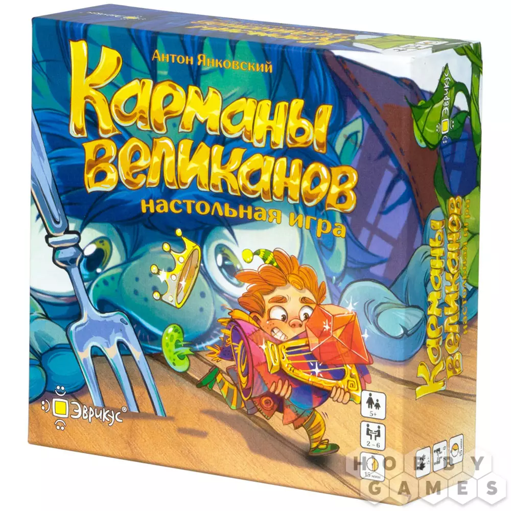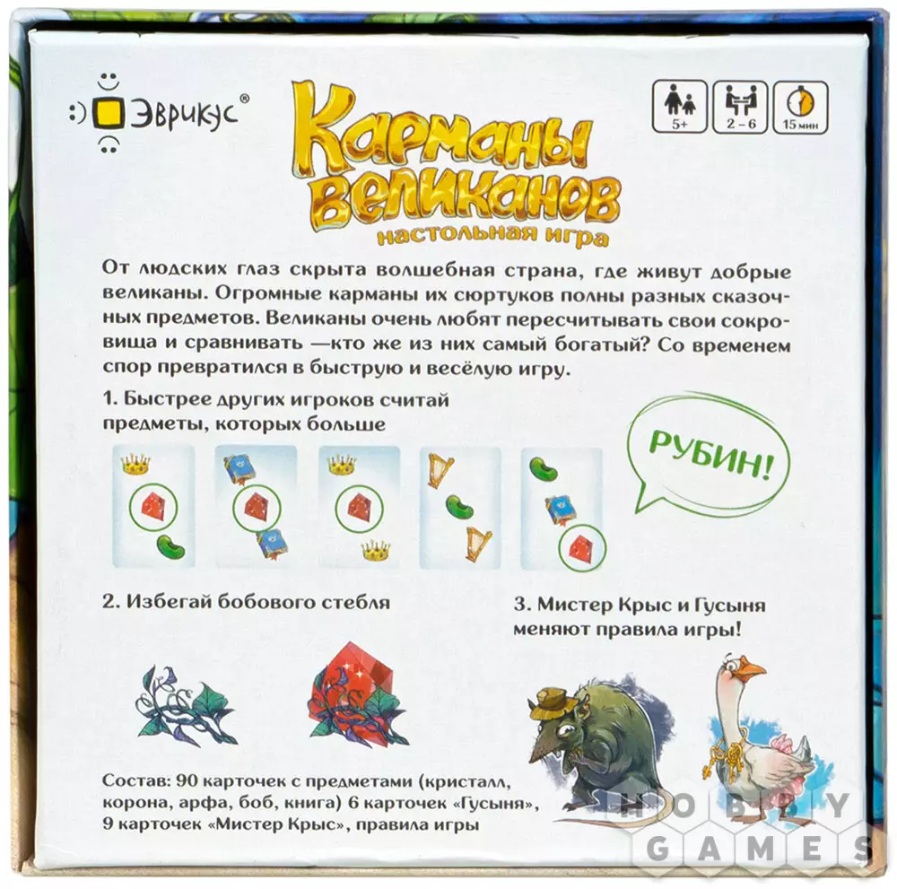 Карточная настольная игра "Карманы великанов" обеспечит весёлое времяпрепровождение за быстрыми партиями. Вы оказываетесь в стране великанов, теперь вам предстоит помочь им посчитать их богатства. Правила игры очень просты: перемешайте колоду карт и раздайте поровну всем игрокам. Смотреть их нельзя, положите перед собой рубашкой вверх. Далее одновременно со всеми игроками произнесите "Как у великана полные карманы...", и выложите в центр стола верхнюю карту своей колоды лицом вверх. А теперь самое время проверить, кто быстрее всех считает: на каждой карточке изображены несколько предметов, они могут повторяться. Нужно назвать предмет, который повторяется больше всего на открытых картах всех игроков. Кто первым правильно посчитал и назвал нужный предмет, побеждает в раунде и забирает себе все карточки. Игра продолжается, пока один из игроков не заберёт себе все сокровища. Но будьте очень внимательны при подсчёте: шумная Гусыня и Мистер Крыс могут нагрянуть в любой момент и кардинально поменять правила игры!