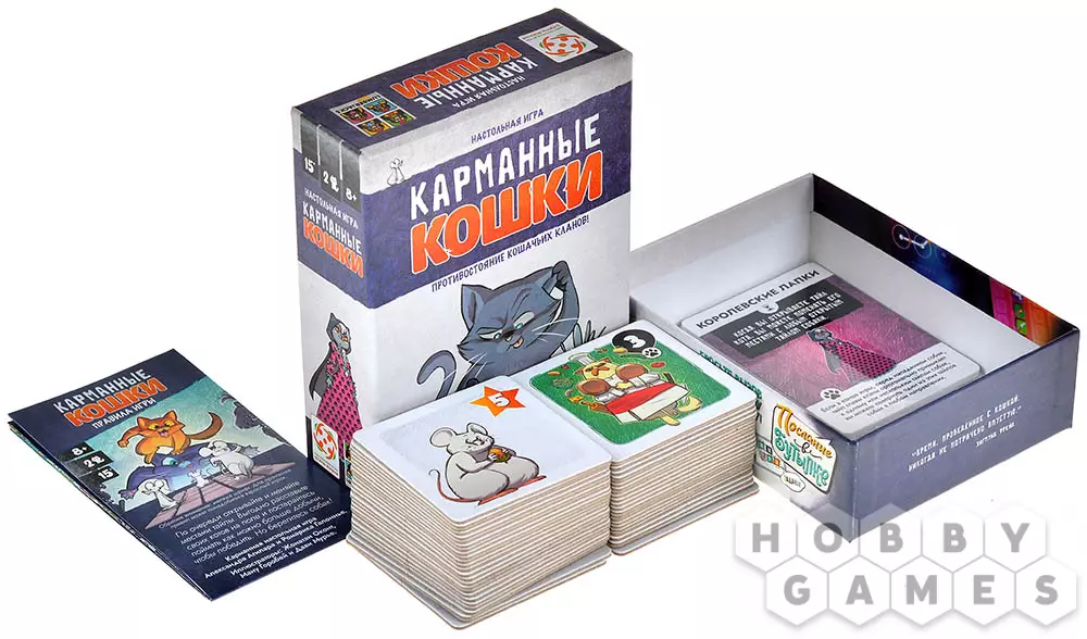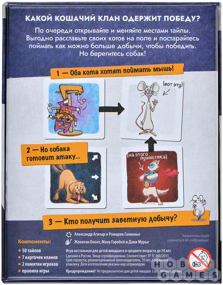 Настольная игра "Карманные кошки" – это простая и увлекательная настольная игра с атмосферой мультика "Том и Джерри". Правила просты: переворачивайте тайлы лицевой стороной вверх и меняйте их местами, чтобы расставлять котов своего клана наиболее выгодным образом. Окружите добычу и поймайте мышку, чтобы забрать её себе. Но остерегайтесь собак!