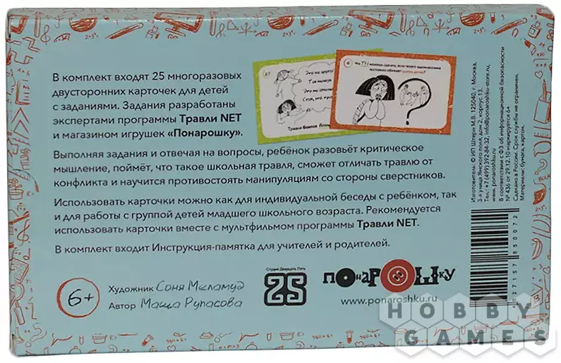 Наборы карточек для детей от издательства "Понарошку" созданы, чтобы помочь родителям или учителям в доступной форме объяснить детям правила поведения в тех или иных сложных ситуациях, с которыми они могут столкнуться (школьные хулиганы, экстренные ситуации и др.). Яркие и дружелюбные рисунки, а также простые и короткие вопросы и задания легче воспринимать, чём оторванные от реальности наставления взрослых, да и дети будут участвовать в игровом процессе гораздо активнее, чем простые слушатели.