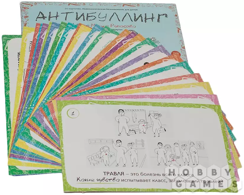 Набор антибуллинговых карточек знакомит детей с понятием травли, раскрывает её причины и последствия, а также отличия от обычных конфликтных ситуаций. Из карточек этого набора ваш ребёнок узнает, как вести себя с агрессивно настроенными школьными хулиганами, что им отвечать и как не поддаваться их манипуляциям. Карточки подойдут как для индивидуального объяснения, так и для группового занятия.