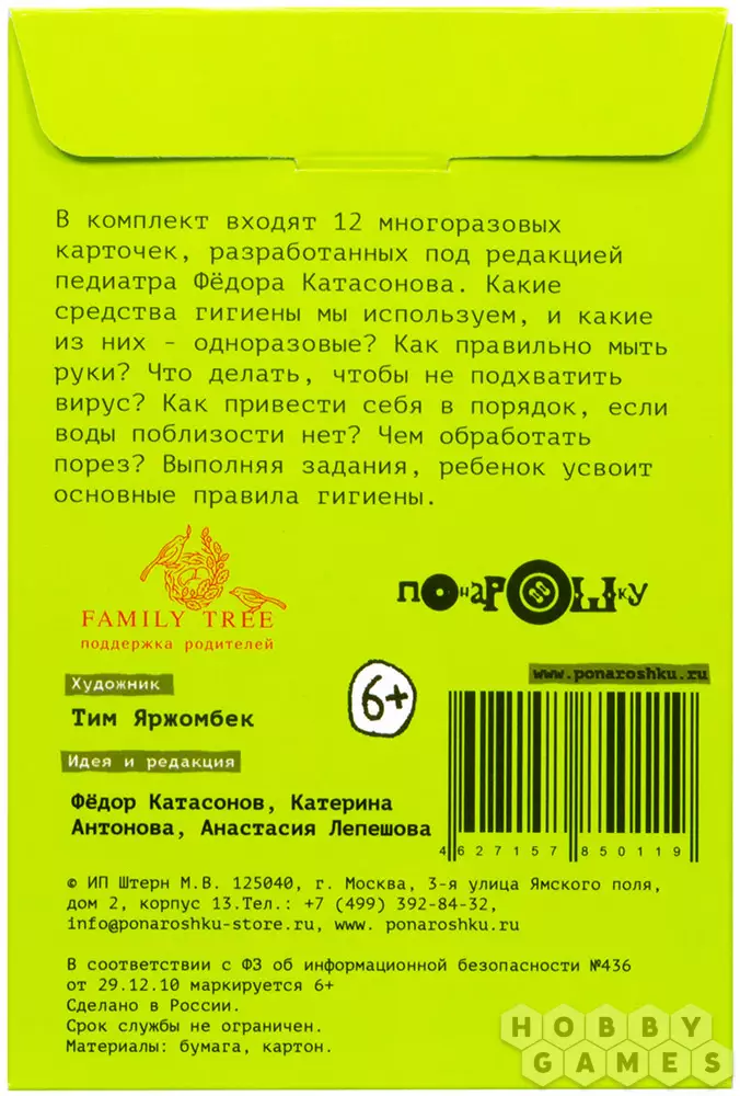 Набор "Карточки гигиены" объяснит вашим детям, как правильно ухаживать за своим здоровьем в быту, зачем надо умываться, чистить зубы или обеззараживать ранки – и как это правильно делать, какие есть средства гигиены и как их правильно использовать. Все советы написаны под редакцией известного детского педиатра Фёдора Катасонова.