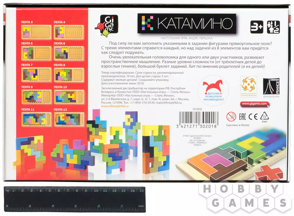 Настольная игра "Катамино" удивляет с первых минут. Эту головоломку можно сравнить с тетрисом или пазлом. Игра подойдёт для развития логики, статегического и аналитического мышления. Суть игры проста: необходимо разместить несколько геометрических фигур, так называемых "пентамино", внутри игрового поля. Для начальных уровней, где требуется заполнить зону, допустим, пять на пять, вам не понадобится много времени, но с каждым добавляемым столбцом сложность будет расти. Чтобы правильно собрать головоломку, необходимо сразу представлять себе, где будет находиться каждый элемент и как он будет соединён с остальными. Если не подходить к решению системно, то придётся очень часто пересобирать фигуры заново.