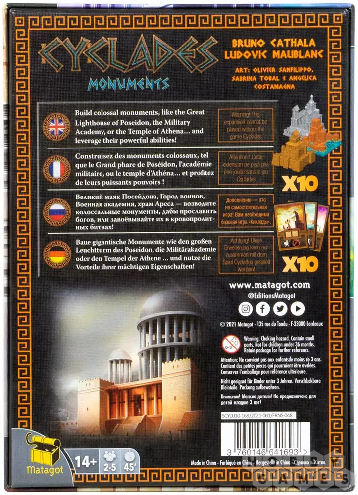 В определённый момент времени, с развитием цивилизации, люди начинают строить здания не только для определённых с практической стороны целей, но и чтобы ублажить свой эстетизм. И в дополнении "Киклады. Монументы" у вас тоже появится такая возможность. Вы будете не просто украшать свои территории величественными архитектурными шедеврами, но и получать за них вполне весомые бонусы. Какой-то монумент позволит восстановить или защитить войско, какой-то позволит получать больше ресурсов. Что из этого вы будете строить – решать вам. Но, конечно, взять и вот так просто возвести монумент у вас не получится, для начала придётся выполнить определённые условия строительства (для каждого монумента они свои). И если выполните их первыми, вы получите колоссальное преимущество перед остальными игроками!
