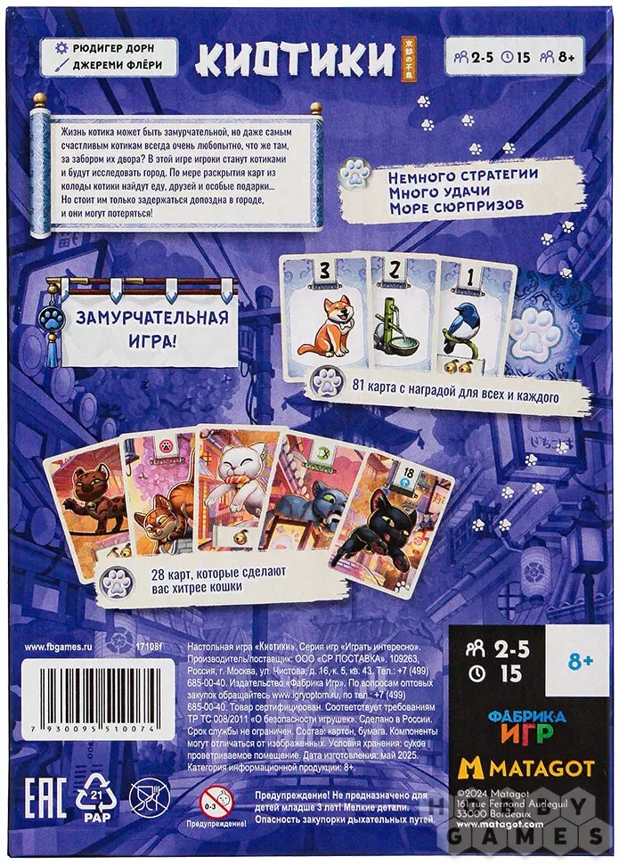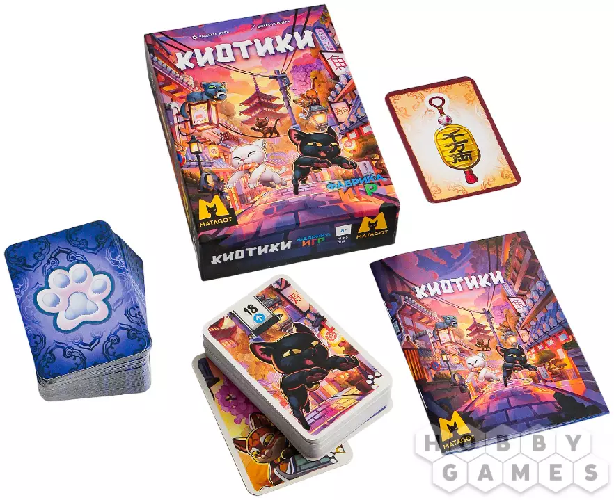 "Киотики" – компактная карточная игра, где вы управляете котиками, жаждущими приключений. Основная механика построена на неожиданном повороте: вы не просто берёте карты, а выбираете, кому они достанутся – себе или соперникам. Каждая карта добавляет часы времени, и если их сумма достигает тринадцати, игрок "задерживается дотемна" и теряет все карты раунда! Но не всё так страшно: на многих картах есть символы, дающие полезные эффекты – от дополнительных ходов до защиты от провала. Уникальность игры в её динамике и тактике: нужно балансировать между риском и наградой, подкидывая "опасные" карты оппонентам. "Киотики" радуют милыми иллюстрациями, а партия длится всего пятнадцать минут – идеально для весёлых посиделок или путешествий!