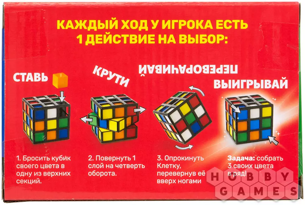 "Три в ряд" – классический жанр компьютерных игр, истоки которого можно найти ещё в "крестиках-ноликах". А что, если смешать идею жанра с кубиками Рубика и добавить туда элементы состязания? Получится великолепный коктейль под названием "Клетка Рубика"! Вместо привычного двухмерного игрового поля игрокам придётся взаимодействовать с клеткой трёхмерного формата. Её нужно наполнить кубиками своего цвета так, чтобы три из них оказались в одной ряду. А ещё клетку можно крутить и переворачивать, чтобы помешать противникам – так что лёгкой эта задача никому не покажется! Придётся по максимуму включать пространственное воображение. Каждый ход игроку нужно будет выбирать одно из действий: или бросить свой кубик сквозь отверстия верхней решётки, или повернуть один из горизонтальных слоёв на 90 градусов, или перевернуть всю клетку полностью.
