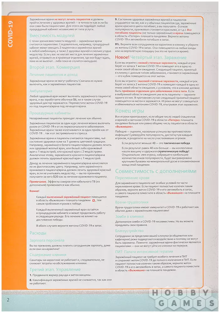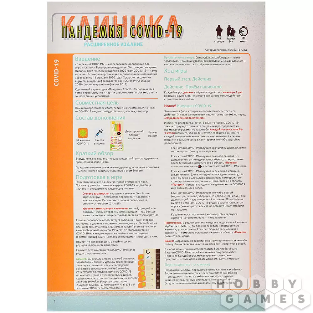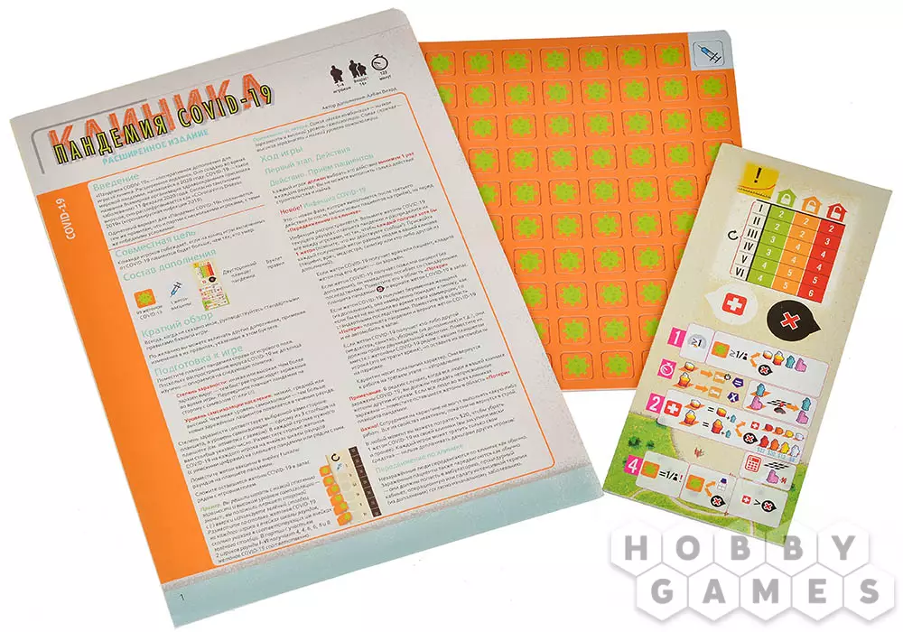 "Пандемия. COVID-19" – это дополнение к игре "Клиника. Расширенное издание", благодаря которому прежде соперничавшие друг с другом владельцы клиник объединят свои усилия и попытаются совместно справиться с коронавирусом. Берите базовую игру, выбирайте заразность болезни – иначе говоря, уровень сложности – и постарайтесь вылечить как можно больше пациентов. Вы победите или проиграете все вместе, так что отложите в долгий ящик обиды и претензии друг к другу, сосредоточившись на высшей цели!