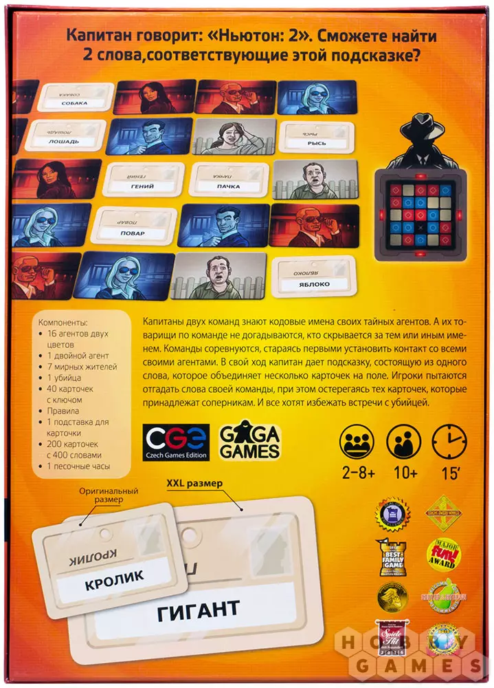 Данная версия отличается увеличенным размером – вся игра стала в два раза больше! Большие карты удобнее держать в руках, да и информацию теперь разглядеть стало гораздо проще. Сами же правила игры остались неизменными. Собирайте за игровым столом большую компанию друзей, родных и близких, да что там – хоть незнакомых игроков, и отправляйтесь в хитрый и запутанный мир шпионских интриг. Весело и интересно будет всем, ведь недаром "Кодовые имена" считается одной из лучших настольных игр для вечеринок!