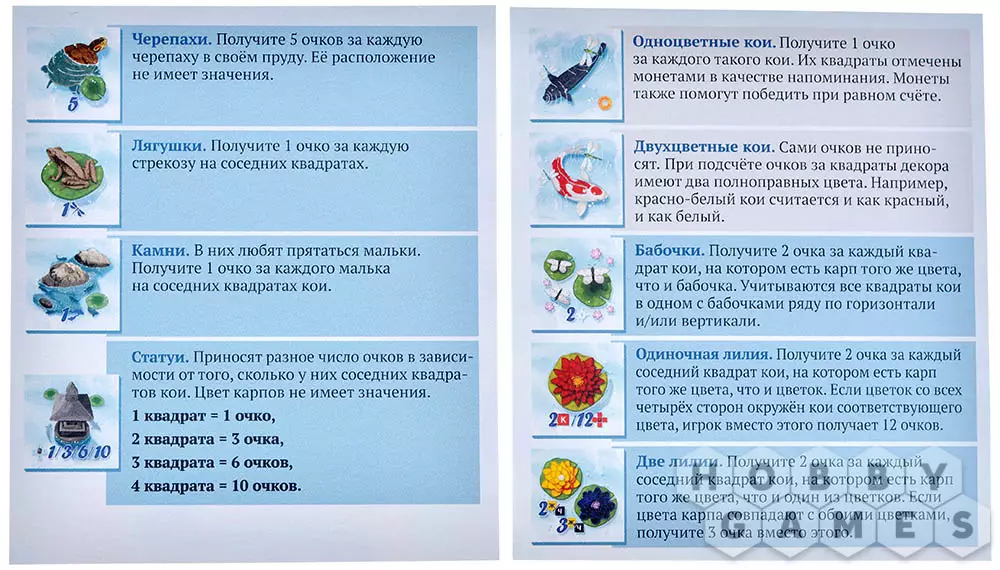 Игроки делают равное количество ходов, и игра заканчивается, когда вам нечем будет пополнить планшет пруда. Начинается подсчёт очков. Каждый квадрат вашего пруда и каждый выбранный элемент декора принесёт вам определённое количество очков. Тот, кто набрал больше всех очков выигрывает!