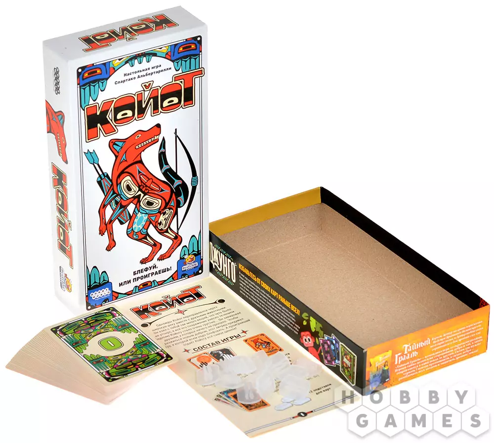 "Койот" – это динамичная и азартная карточная игра на блеф и внимательность. Вам предстоит по очереди называть предполагаемую сумму значений всех карт, лежащих на столе, – однако часть из них закрыл Койот. Как же не проиграть, не зная, будет ли следующий шаг излишним?
