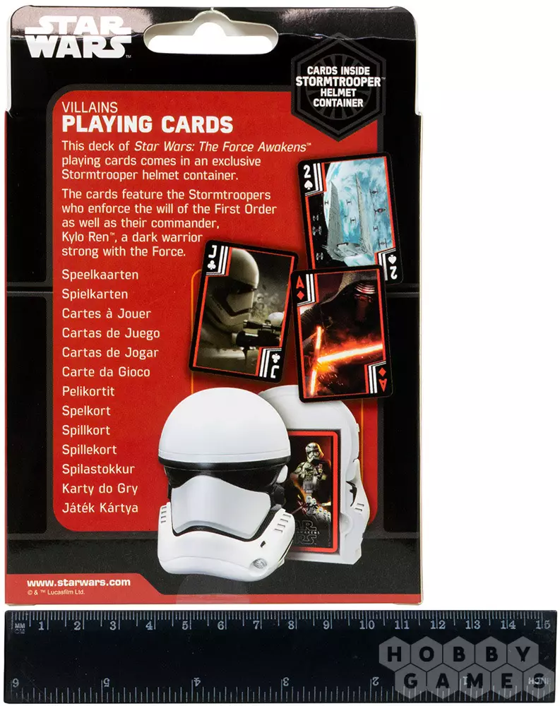 Это коллекционное издание станет настоящим подарком всем поклонникам вселенной "Звёздных войн" – на лицевой стороне карт вы найдёте любимых персонажей киносаги, но это не самое главное! Колода упакована в уникальный футляр в виде шлема Имперского штурмовика. Поставьте его на полку и никто не догадается, что там спрятано внутри!