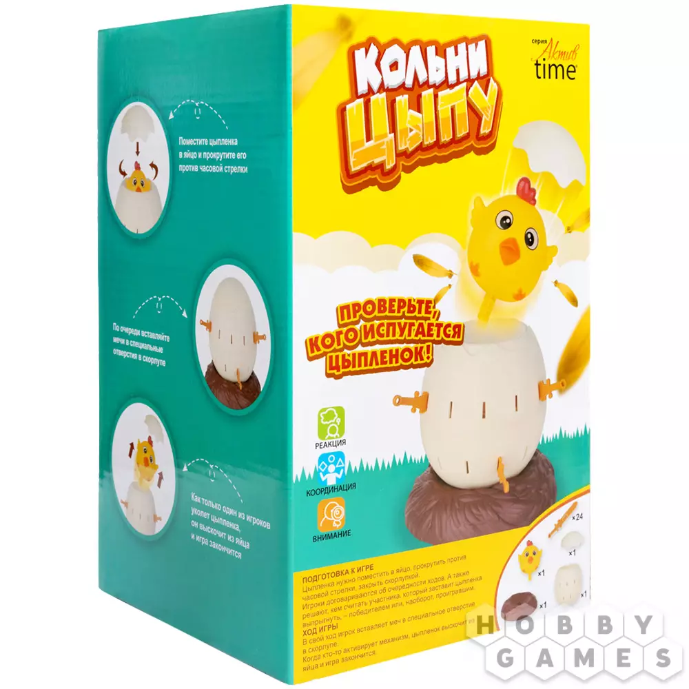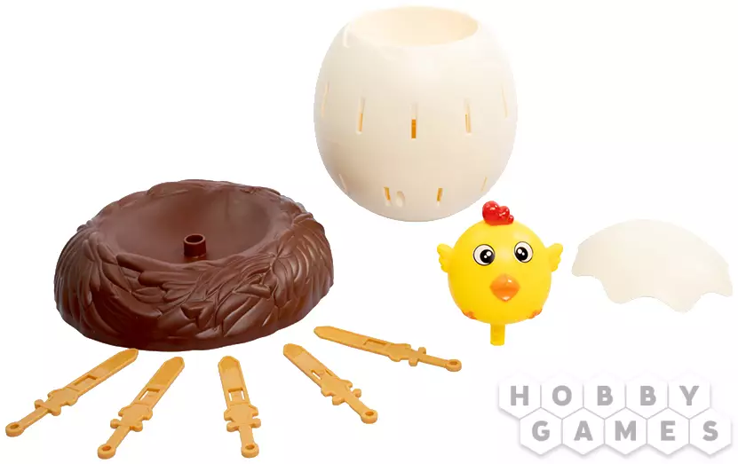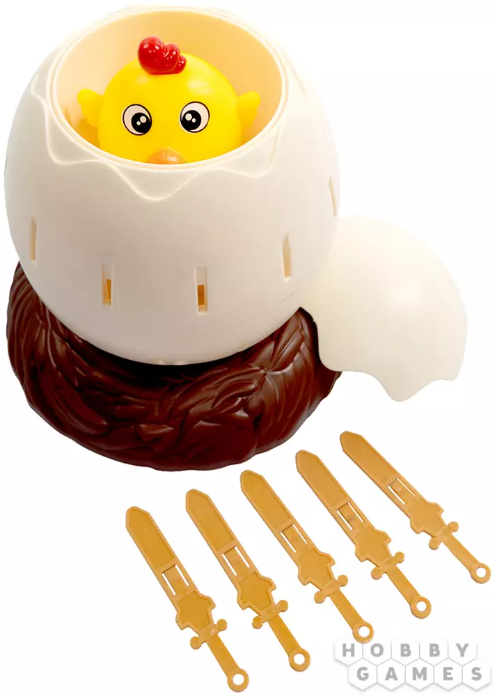 Чтобы сыграть в "Кольни цыпу", посадите цыпу в яйцо, которое теперь нужно аккуратно закрутить и установить в центр стола. Ваша задача – поочерёдно брать мечи (бутафорские!) и вставлять их в отверстия на скорлупе. Первый, кто заденет скрытый внутри механизм и разбудит маленького цыплёнка, станет победителем! Малыш наверняка будет недоволен, что ему не дали подремать, зато вы сможете поумиляться тому, какой он всё же крошечный и хорошенький! Только посадите его потом обратно – пускай всё же отдохнёт.