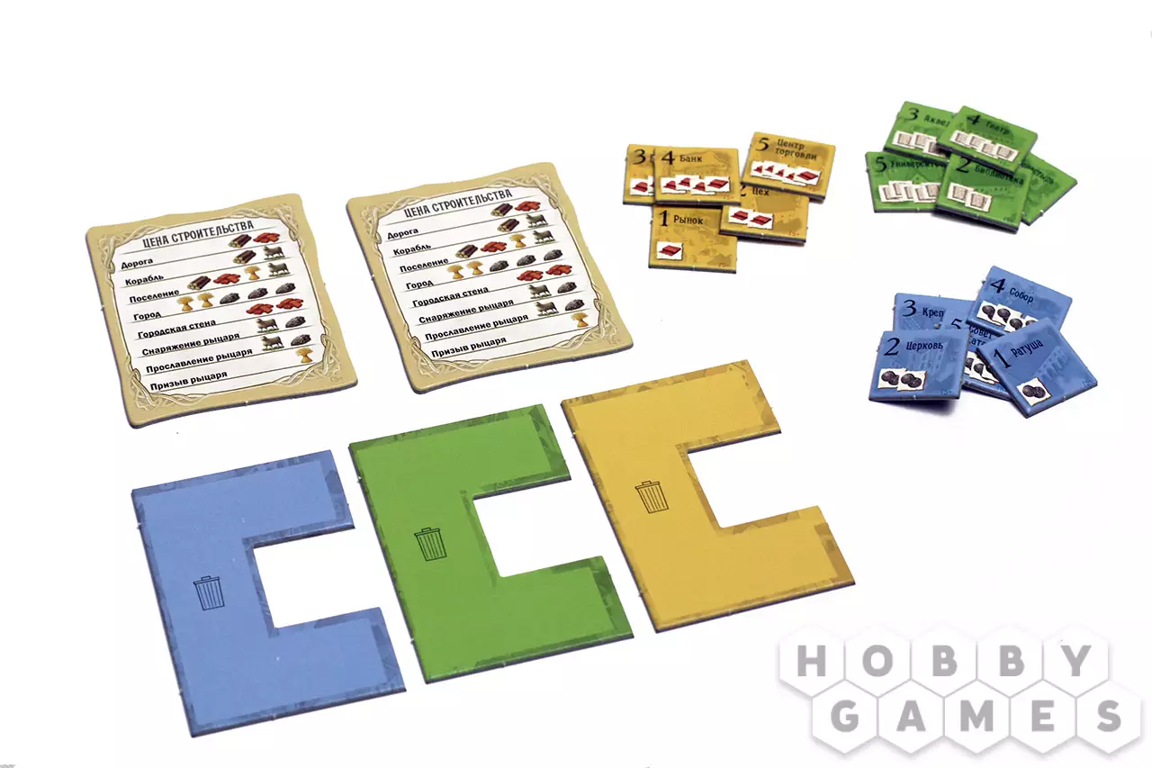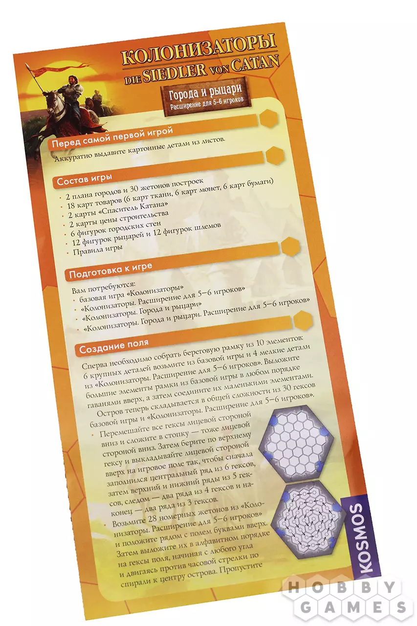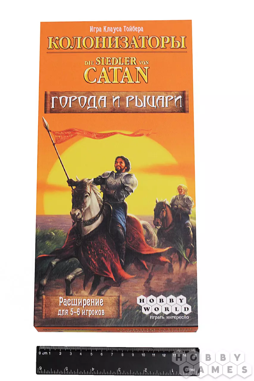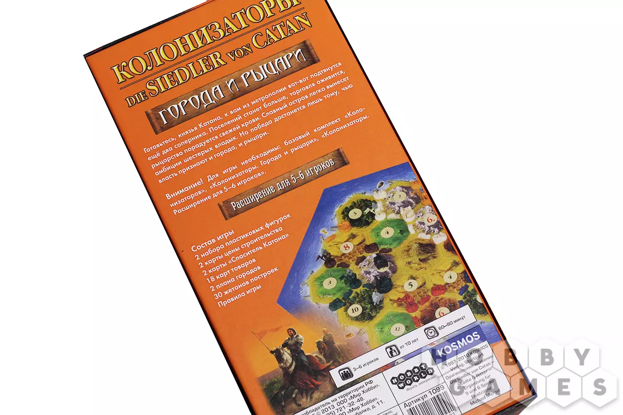 Александр20.08.2013 21:13Для зелёного и коричневого цветов по 3 (в общем — 6) "столичных" пластиковых "насадки" (на такие города: http://hobbygames.ru/image/cache/hobbygames/data/common/catan56/colonizatory-5-6-09-1024x1024.jpg), по 6 рыцарей с шлемами для прославления. Ну и два плана городов с жетонами, некоторое количество карт товаров и 2 карты победных очков "освободитель Катана". Комплект полный и качественный.