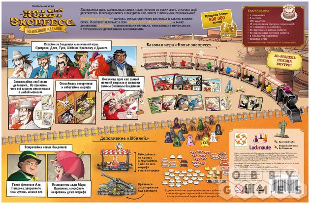 В эту коробку вошли базовая игра и полностью новое дополнение "Юбилей", которое приносит с собой два дополнительных вагона, уникальных персонажей, новые механики и усовершенствованные компоненты. Особое внимание заслуживают улучшенные деревянные жетоны, вагон-цирк, дрезина и фигурки бандитов, знакомых по классической версии и другим дополнениям серии.