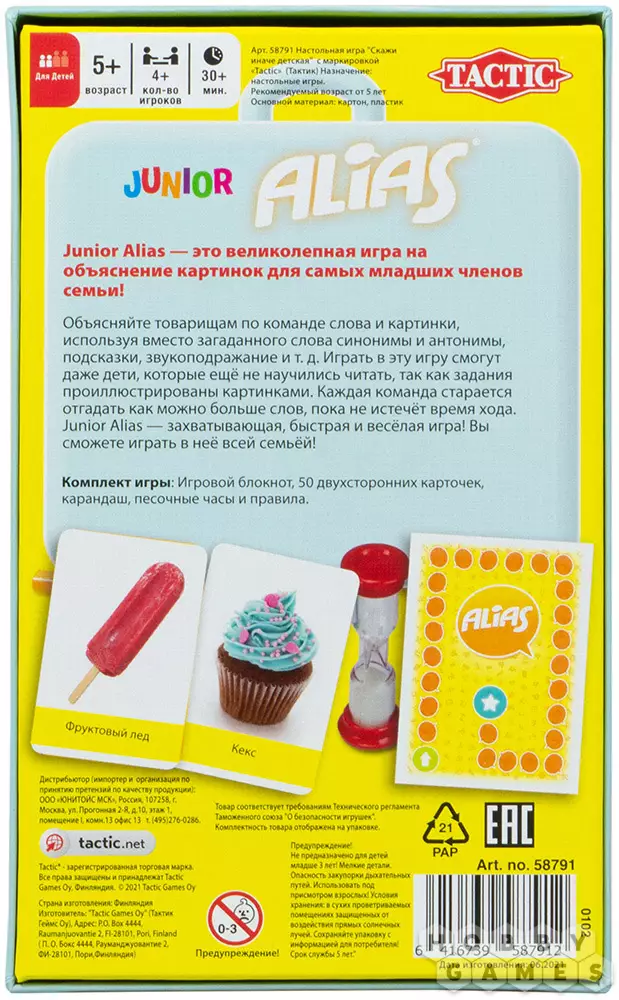 Перед нами адаптированная версия игры для самых маленьких. Основное отличие здесь в том, что слова на карточках не только написаны, но и изображены. Слов в наборе получается меньше, чем в классической версии, они проще и понятнее, но это позволяет расширять словарный запас нашим детям, а также развивать мышление.