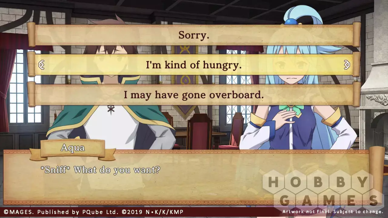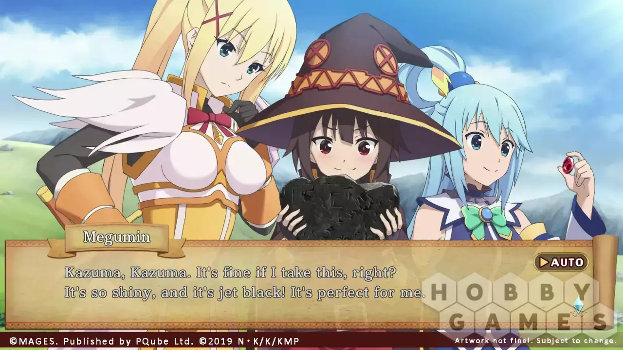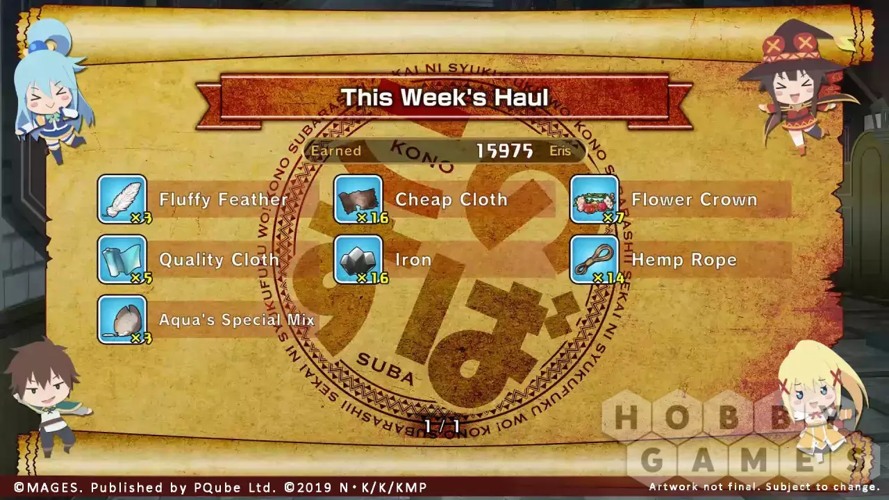 Follow Kazuma and company, as they discover a mysterious "Black Slab" which curses them with desires contrary to their personality. The gang must now find and feed ingredients to the slab to create outfits which match and fulfil their new desires, and thus break their curse. Are you ready to meet Darkness as a ruthless dominatrix? How about Aqua as a prim and proper goddess? Or Megumin as the proud leader of the Lolita League?