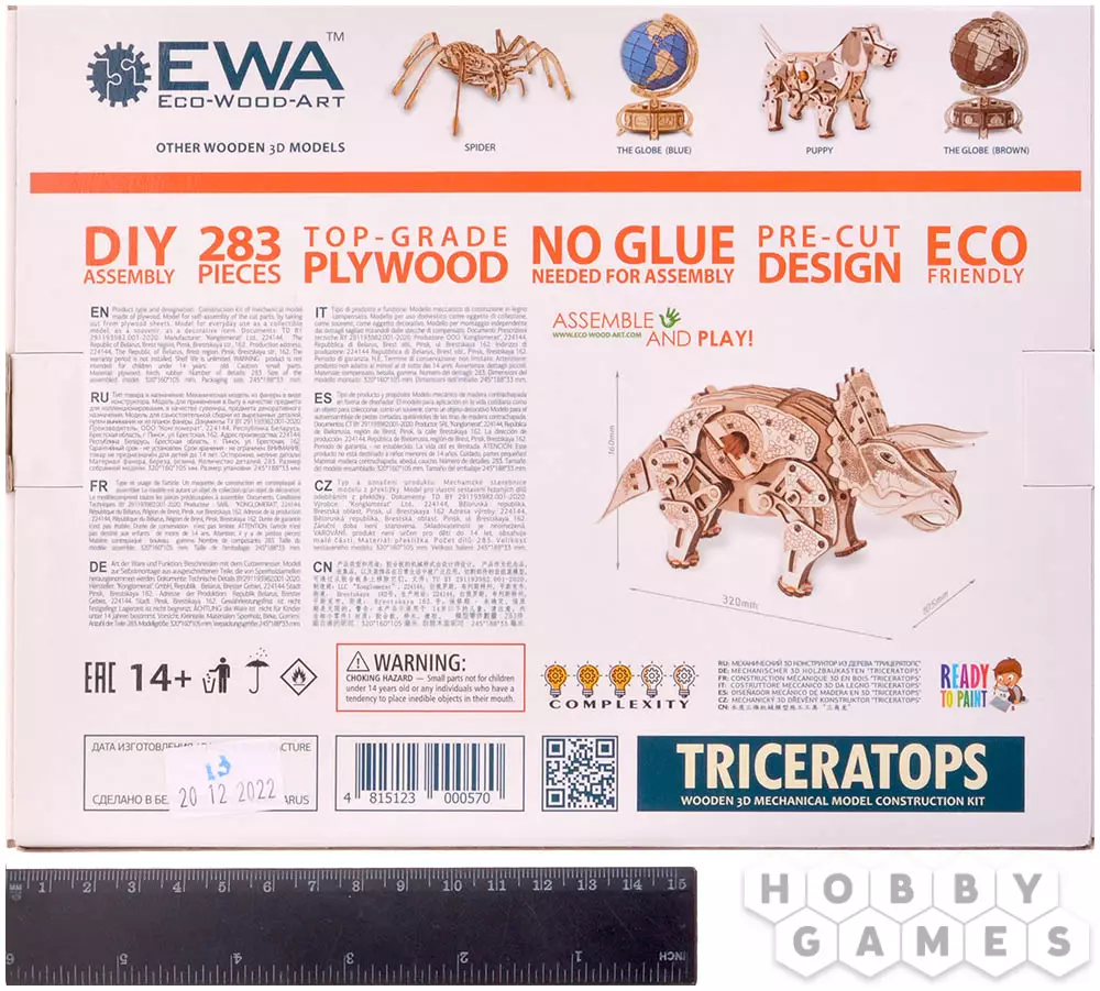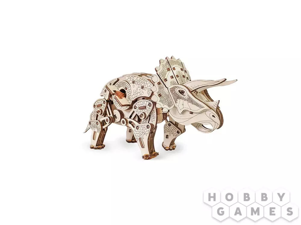 Модель из экологически чистых материалов, предназначенная для самостоятельной сборки и имеющая механизм, приводящий в движение. У механизма есть ручная заводка и возможность запускать и останавливать Динозавра. Конструкция деревянной модели позволяет ей двигаться максимально реалистично: во время движения Трицератопс качает головой и эффектно виляет хвостом, чем вызывает бурю положительных эмоций у детей и взрослых. Это идеальная игрушка, замечательный подарок и достойный предмет коллекционирования для дома и офиса.