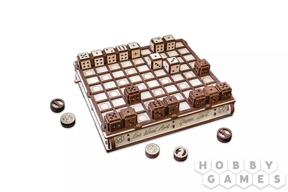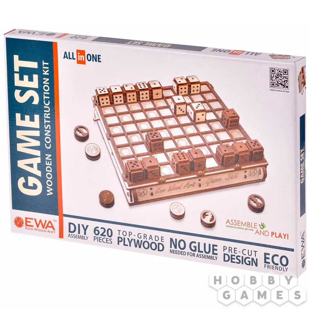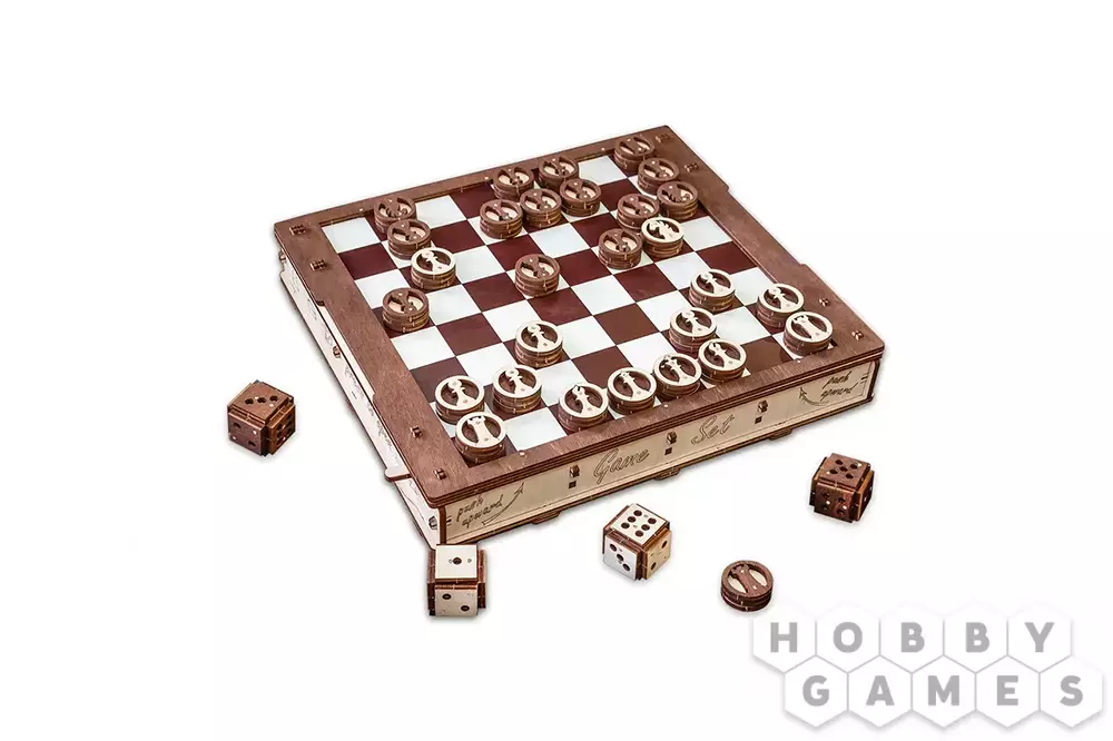 В набор входят такие классические настольные игры как шахматы и шашки, а также интеллектуальная игра "Поединок".