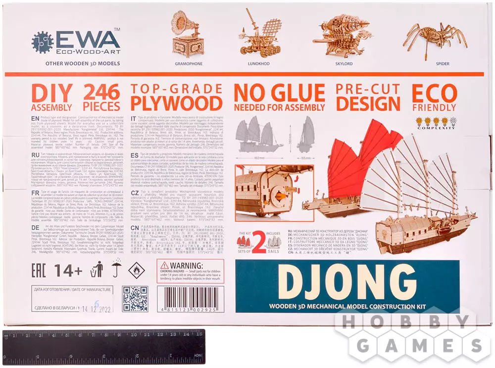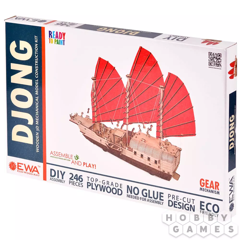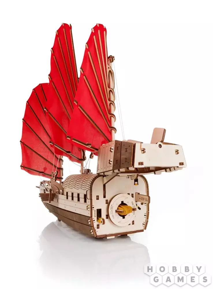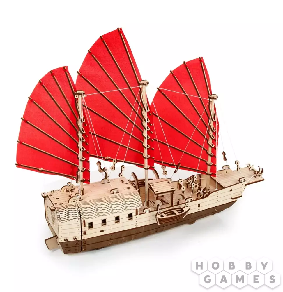 Сборная модель деревянного корабля EWA Джонка. Мы не можем называть наш парусник деревянным конструктором, потому что наша модель механическая с заводным двигателем на резинке. Джонка – это традиционное в юго-восточной Азии парусное судно для плавания по рекам и морским побережьям. Деревянный корабль большой по размеру, целых 46 см в длину и 39 см в высоту. Выглядит, как настоящий, с парусами, шлюпками, тросами и мачтами. Eco Wood Art выпускает первый деревянный корабль из фанеры. Этот корабль порадует всех и детей и взрослых и заядлых моделистов.