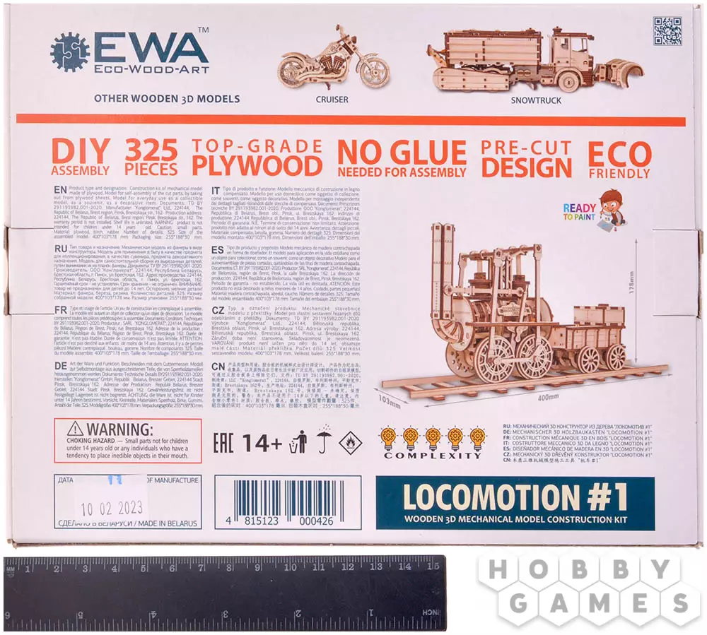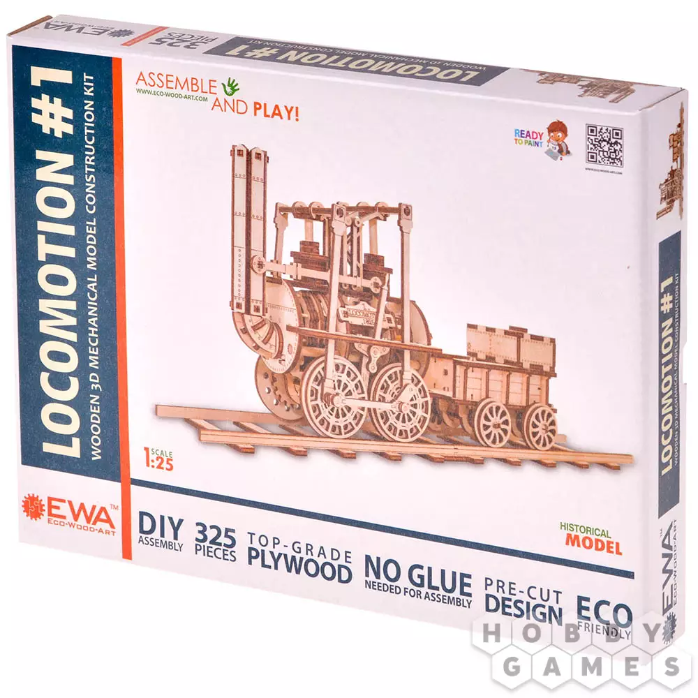 "Локомотив" – механическая модель локомотива выпуска 1825 года, который первым перевез людей по первой в мире общественной железной дороге Стоктон – Дарлингтон в Великобритании. Историческая действующая модель с резиномотором для самостоятельной сборки. Даёт общее представление о механике передачи движения от двигателя на колеса. Идеальная настольная модель паровоза в сцепке с тендером на фрагменте железной дороги.