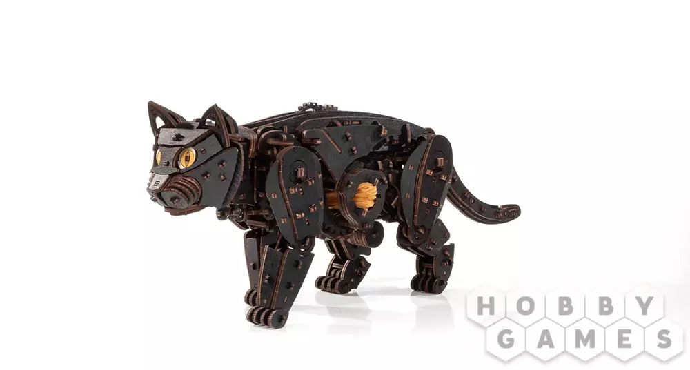 Модель из экологически чистых материалов, предназначенная для самостоятельной сборки и имеющая механизм, приводящий в движение. У механизма есть ручная заводка и возможность запускать и останавливать Кота. Конструкция деревянной модели позволяет ей двигаться максимально реалистично: во время движения Кот мило перебирает ножками, машет хвостом, чем вызывает бурю положительных эмоций у детей и взрослых. Это идеальная игрушка, замечательный подарок и достойный предмет коллекционирования для дома и офиса.