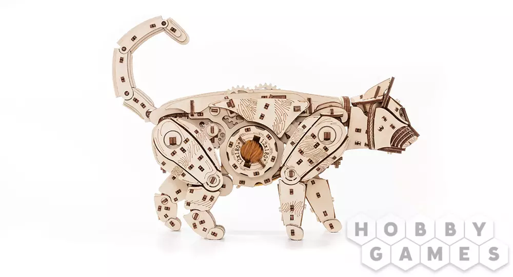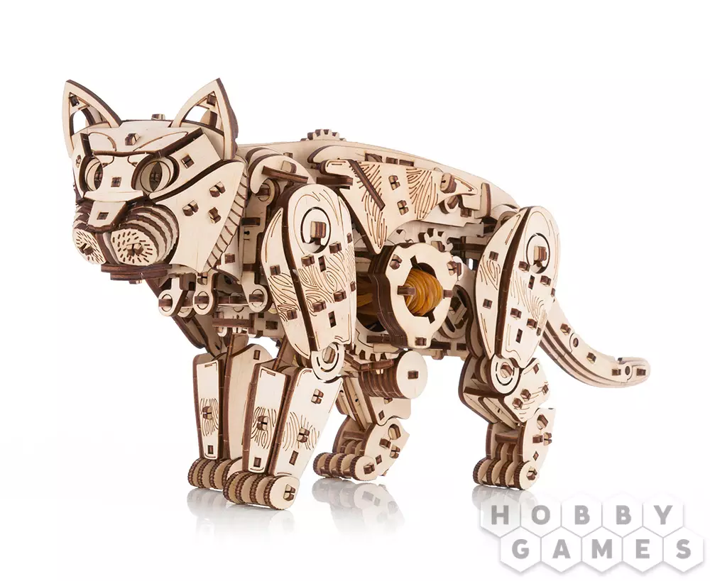 Модель из экологически чистых материалов, предназначенная для самостоятельной сборки и имеющая механизм, приводящий в движение. У механизма есть ручная заводка и возможность запускать и останавливать Кота. Конструкция деревянной модели позволяет ей двигаться максимально реалистично: во время движения Кот мило перебирает ножками, машет хвостом, чем вызывает бурю положительных эмоций у детей и взрослых. Это идеальная игрушка, замечательный подарок и достойный предмет коллекционирования для дома и офиса.