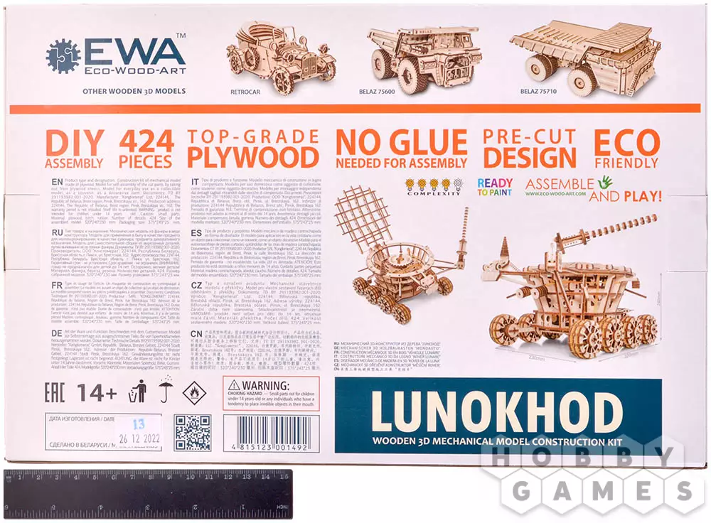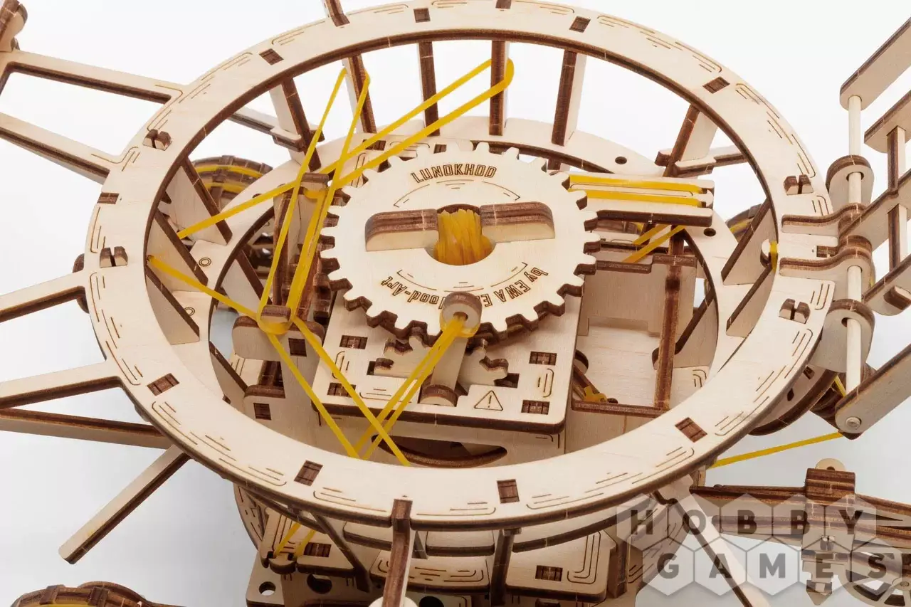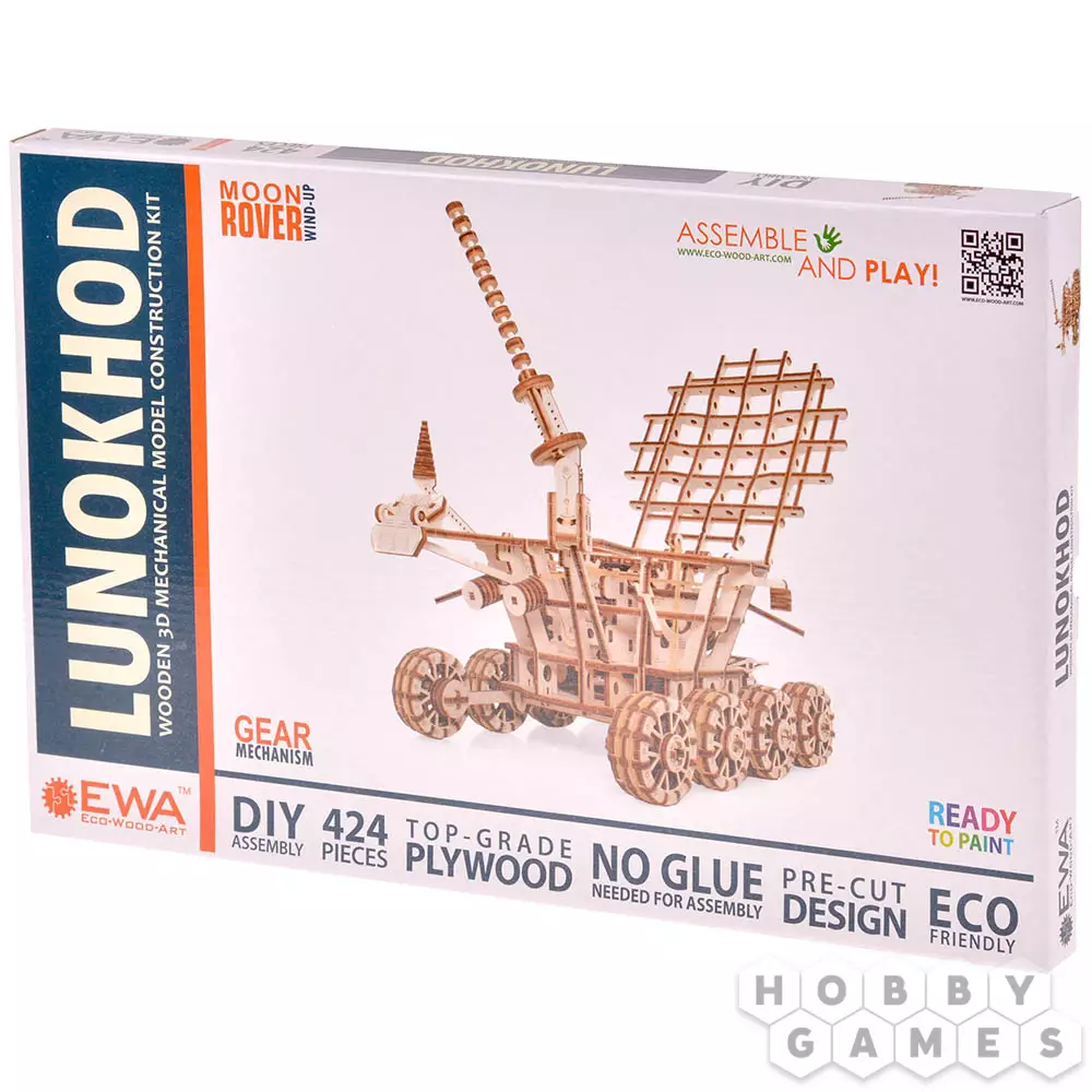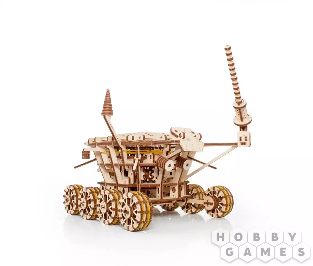 Робот Луноход – Механическая 3D-головоломка модели лунохода, оснащенного двигателем с резиновой лентой, работающим на амортизирующих колесах. Деревянная сборная модель имеет вращающуюся антенну и имитацию откидной крышки с солнечными панелями. Модель собирается как деревянный конструктор без клея.