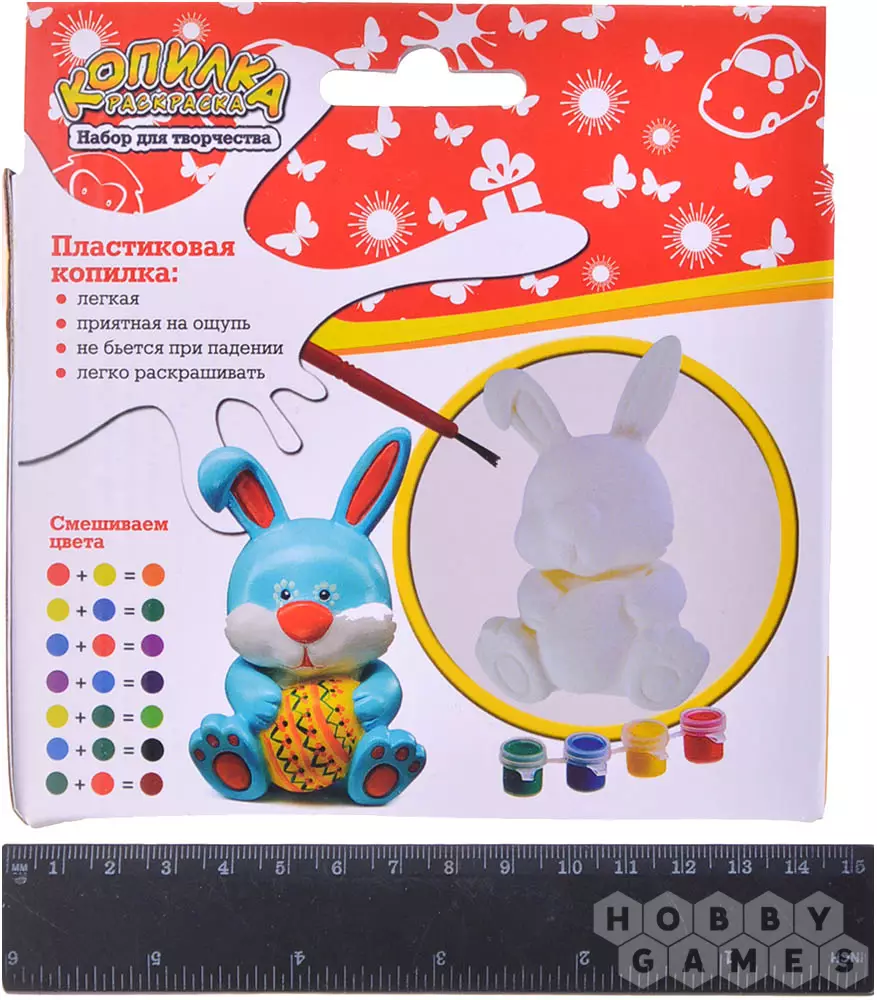 В данном наборе вы найдёте пластиковую копилку, готовую для раскрашивания: в комплект уже включены основные краски и кисточка!