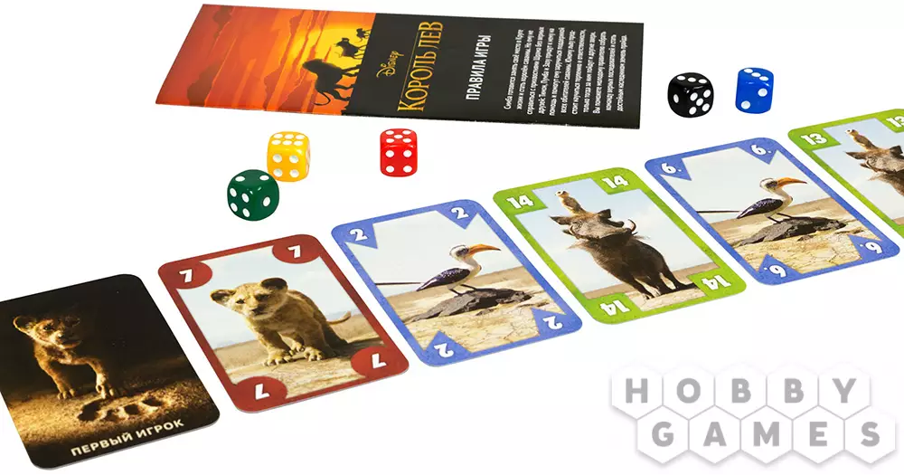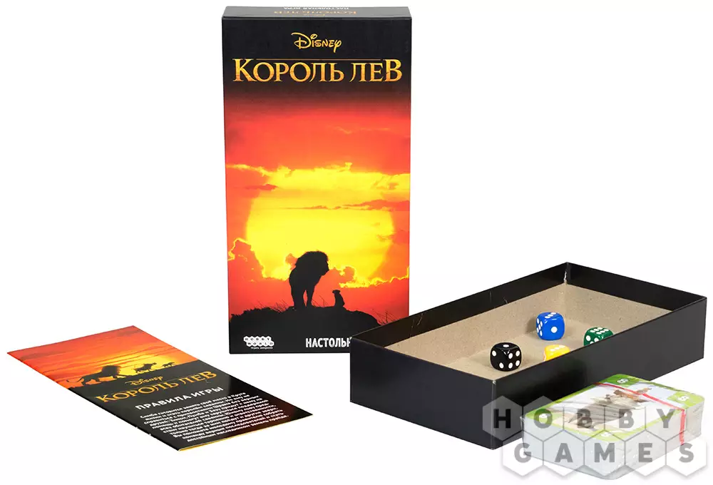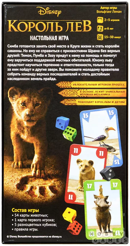 "Король лев" – это детская настольная игра по мотивам ремейка культового мультфильма, которая подарит вам чарующее ощущение любимой истории. В качестве иллюстраций карт используются кадры из фильма. По ходу игры вам предстоит собрать свою стаю животных и заручиться их поддержкой, а тот, чья стая окажется больше – станет королём саванны!