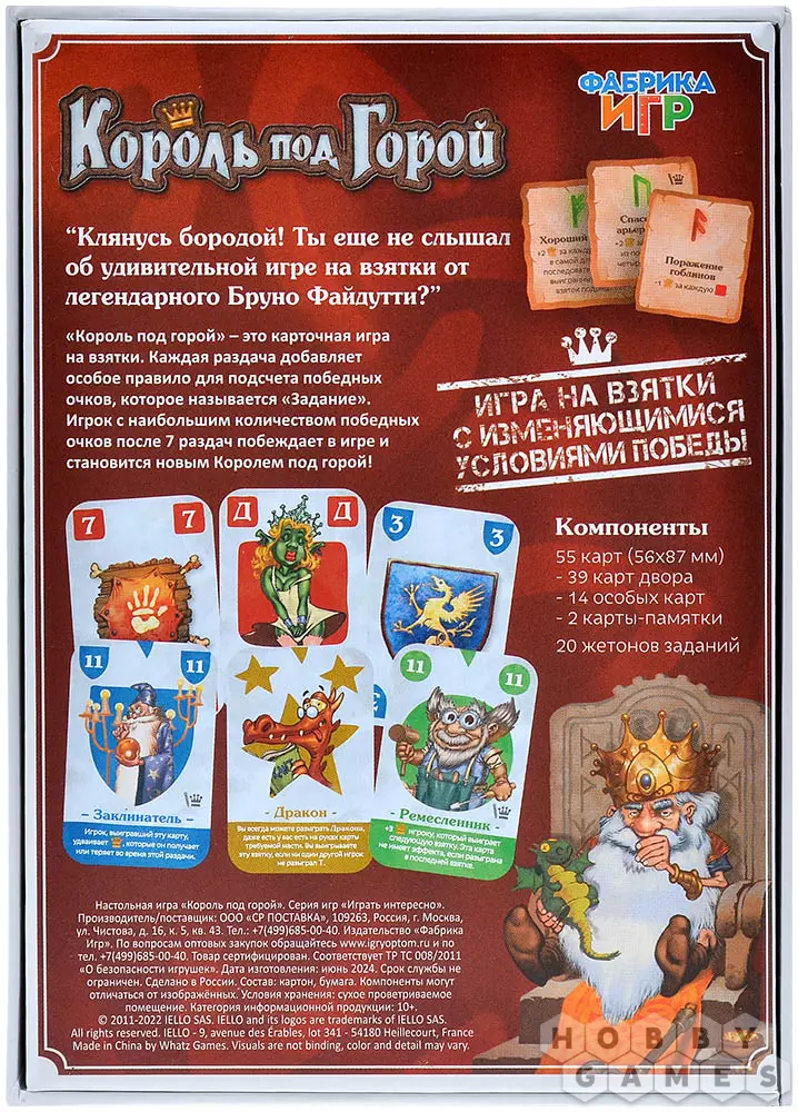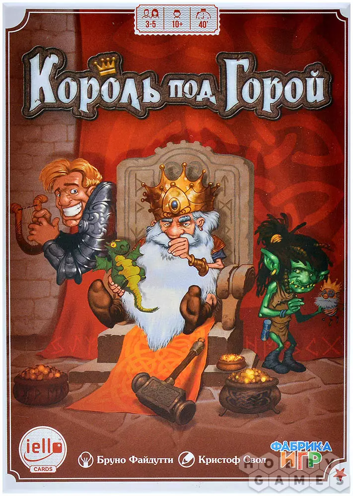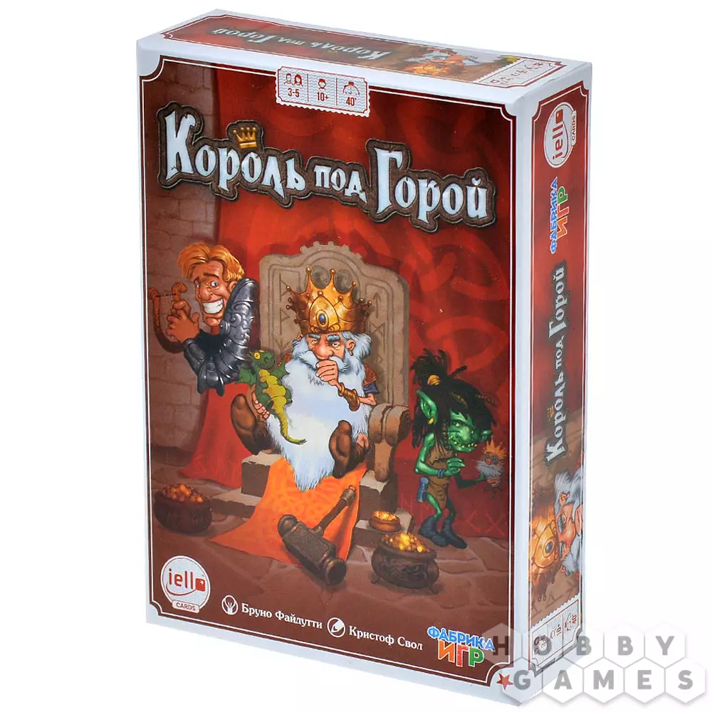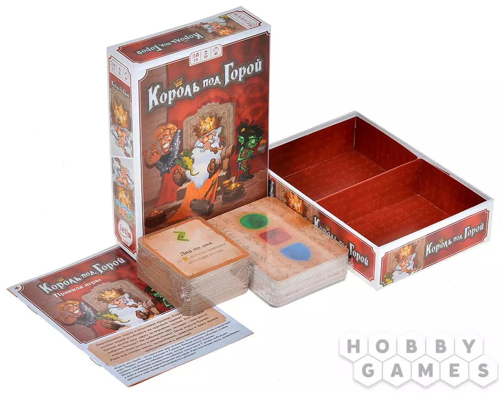 "Король под горой" – это карточная игра, главная цель в которой – набрать очки. Иначе говоря, игра на взятки. Она вдохновлена классическими "Червами", но если в "Червах" очки приносят карты масти, выведенной в название, то здесь условия продвижения по пути к победе меняются каждую раздачу благодаря особым вытянутым жетонам заданий. Сначала это могут быть короли, а потом – все чёрные масти, а может быть – только чётные значения и при этом нужно избегать семёрок. Получается всё ещё легко и азартно, но при этом неожиданно и требует внимания и умения адаптироваться. Ваша задача – набрать как можно больше победных очков и победить в этом ожесточённом турнире, ведь на кону – звание нового Короля под горой!