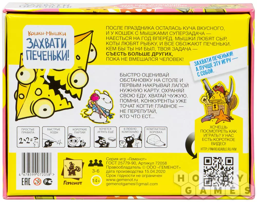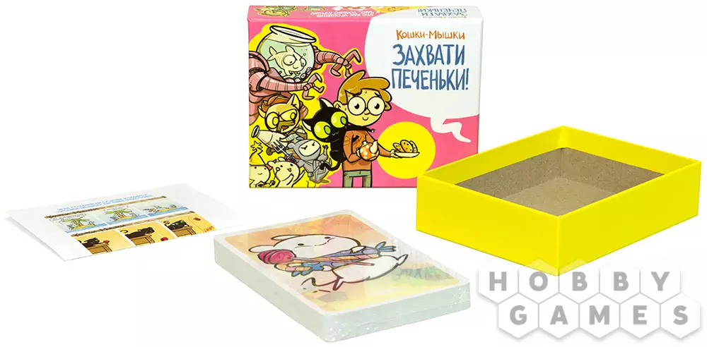 Примерьте на себя кошачью или мышиную шкуру и вперёд – лакомьтесь рыбкой, если вы кот, и сыром – если отважная мышь, а сладкие печеньки придутся по вкусу всем! Партии в "Кошки-Мышки" протекают весело и быстро, но именно скорость игры заставит вас не раз поломать голову. Эта настольная игра, созданная по мотивам культовых комиксов, отлично впишется как в семейные, так и в дружеские посиделки, а также доносит до нас нетривиальную мысль – печеньки к чаю это один из важнейших ресурсов в мире. Покажите своим друзьям или родным мышиную скорость или кошачью ловкость и завладейте всеми кондитерскими изделиями! И не зевайте – захваченную еду нужно охранять!