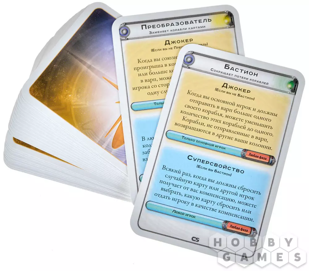 Затем из карт замешиваются колода судьбы и космическая колода. Посреди стола располагается Варп со шкалой для счётчиков далёких колоний. Теперь всё готово для начала первого хода: эта честь может быть отдана, например, самому молодому из участвующих игроков. Совершающий ход игрок именуется Агрессором.