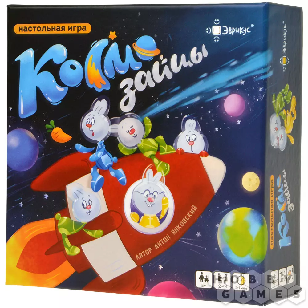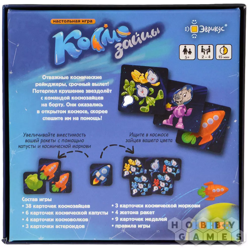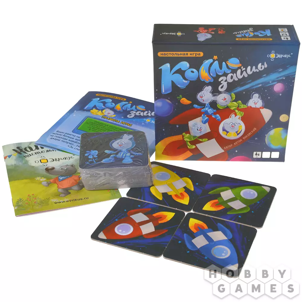 "Космозайцы" – это простая и быстрая карточная игра, в которой игрокам нужно собрать как можно больше зайцев своего цвета. В игре есть несколько типов карт космоса: