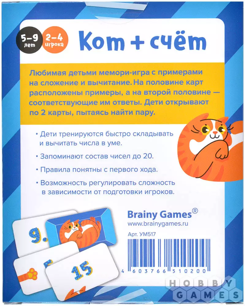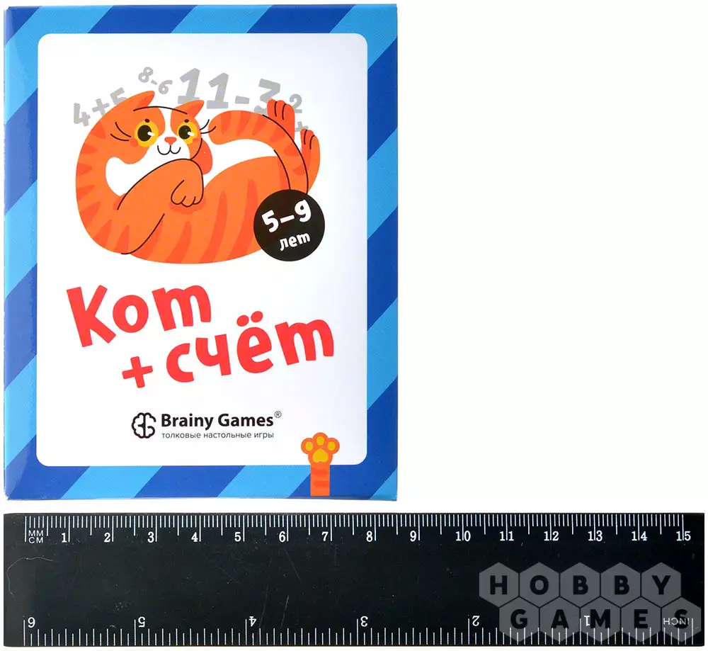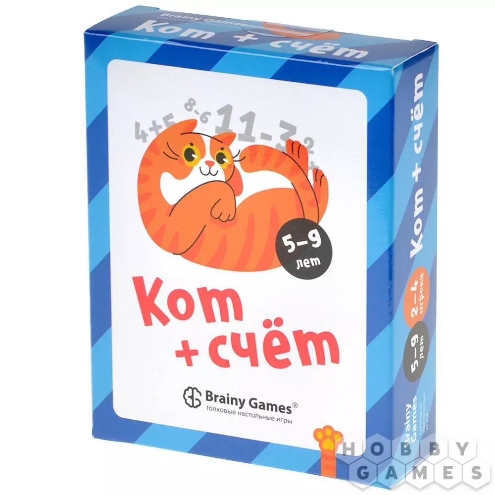 "Кот + счёт" – настольная игра в механике "мемори", которая так нравится детям. Правила максимально просты и объясняются буквально за минуту. На 20 картах напечатаны числовые примеры, а на остальных – ответы на них. Перед началом игры нужно разложить карточки прямоугольником 5 на 8 рубашкой вверх. Участники игры ходят по очереди. Первым может быть самый взрослый из ребят или же его определят при помощи жребия.