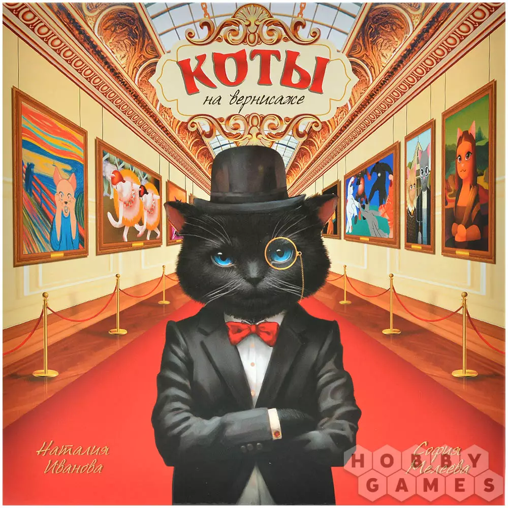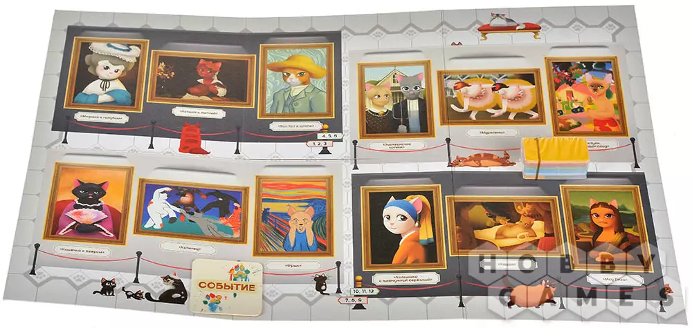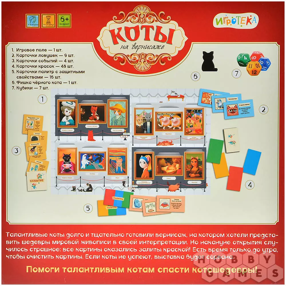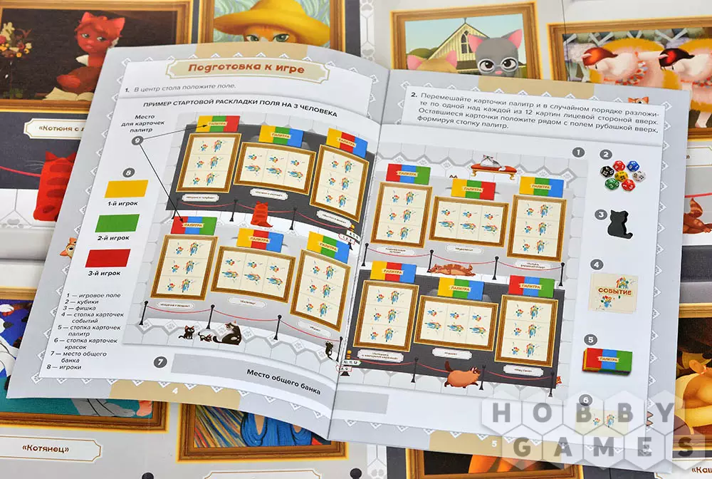 Игра "Коты на вернисаже" – это увлекательная кооперативная история. Ваша задача: собирать нужные цвета (ориентируясь на палитру), искать пары оттенков среди карточек на руках, обменивать недостающие и ловко избегать проделок коварного Чёрного кота.