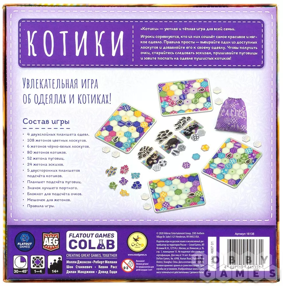 pax23.05.2021 20:58Отличная семейная игра. Не смотря на то, что она 14+ в правилах есть режим, с которым можно играть и с детьми младше. Некая смесь Azul + Пэчворк. Надо привлекать котиков на одеялко и пришивть к нему пуговки. Котики любят узоры, а пуговки пришиваются по цветам. Плюс есть по три паттерна, за которые так же можно получать победные очки. Иногда прям заставляет напрячь мозги, но это и хорошо! В конце игры у каждого игрока будет законченное одеялко. Это приятнее чем в Азуле или печворке, т.к. здесь оно закончено. В общем игру рекомендую!
