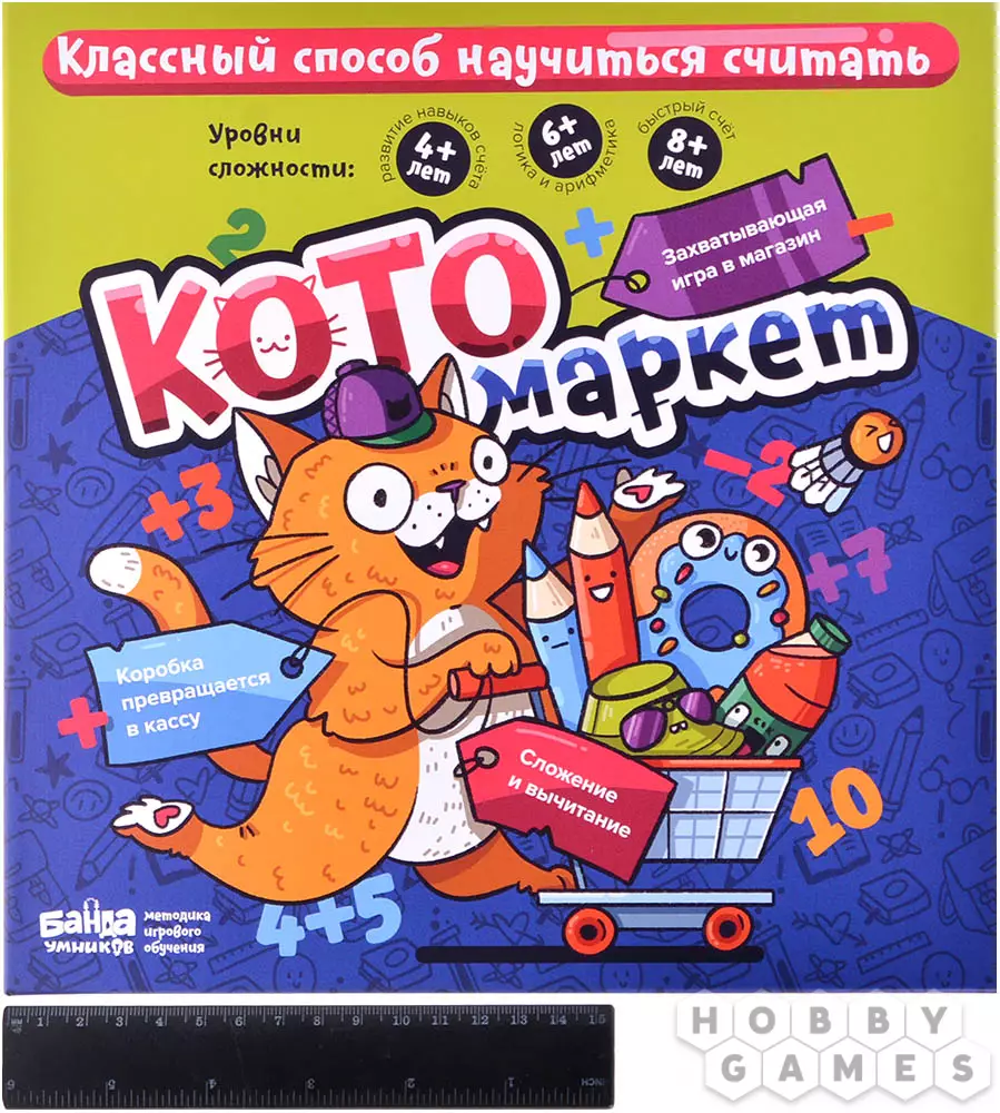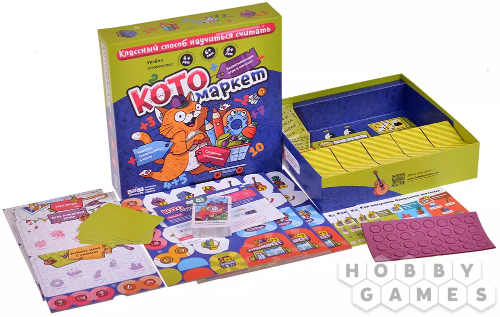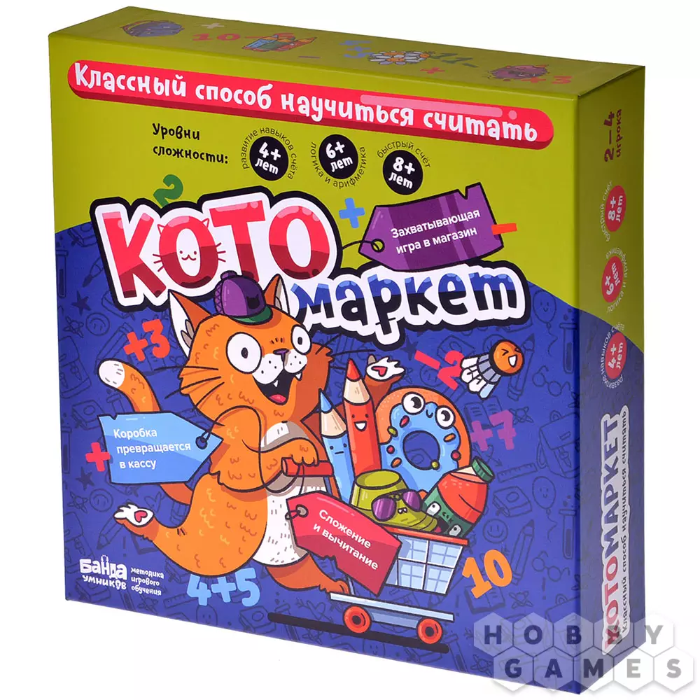 Настольная игра "Котомаркет" – это почти настоящий магазин: в комплекте вы найдёте фигурные жетоны различных товаров, жетоны монет, и даже встроенную в коробку кассу! Помимо увлекательного времяпрепровождения, игра ещё и помогает развиваться – дети научатся складывать и вычитать, а интересные задания сделают этот процесс ещё веселее. А ещё в игре предусмотрены различные уровни сложности игры для детей от 4 лет, 6 лет и 8 лет.