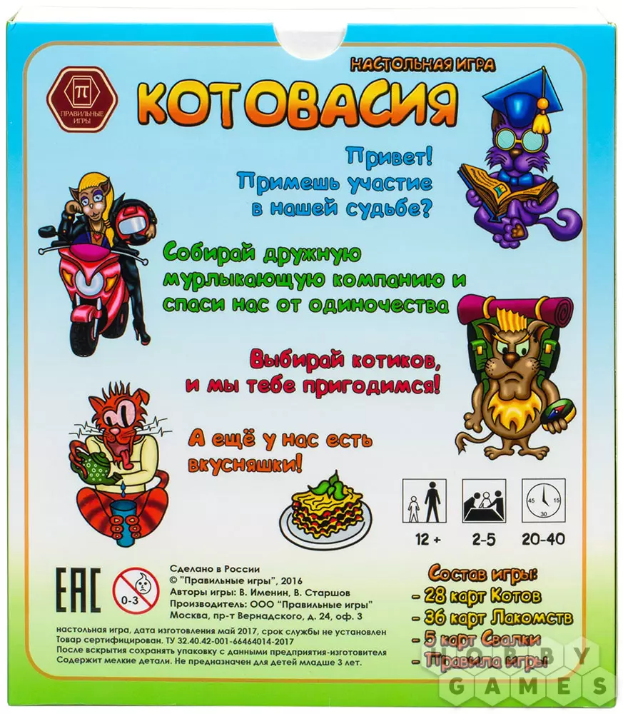 Однако, как вы сможете убедиться, таких добряков на свете великое множество! В увлекательной настольной игре "Котовасия" вам предстоит выиграть соревнование за звание самого великодушного кошатника: подбирайте бездомных котиков, откармливайте их, почешите брюшко, приучите к лотку и сделайте всё, чтобы им не захотелось сбежать обратно во двор или к какому-нибудь более заботливому хозяину. Приютите 6 любимцев первым – и станете победителем игры.