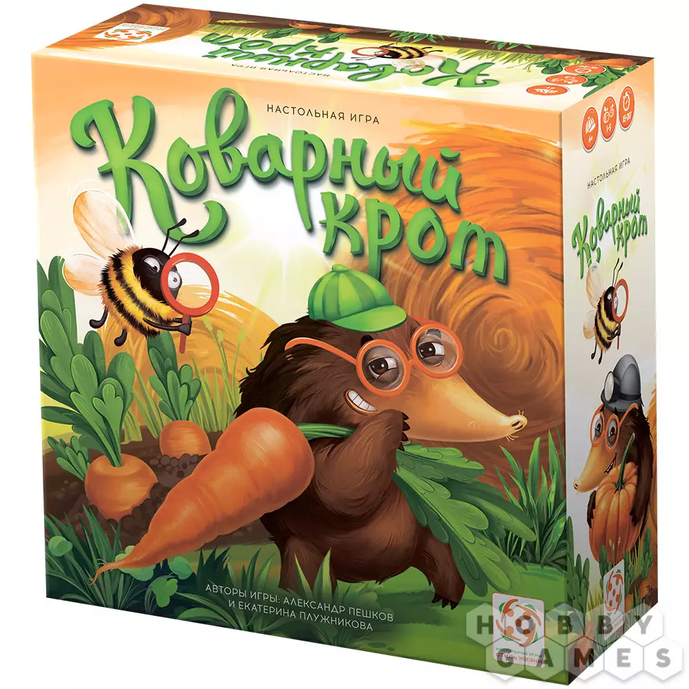"Коварный крот" – это настольная игра для самых проницательных садоводов! Вам предстоит расследовать загадочные пропажи овощей с грядок. Ваша цель – вычислить, какой именно овощ он припрятал в этот раз. И в какой из своих многочисленных норок его спрятал! Главной особенностью игры является детективный геймплей, построенный на дедукции и внимании. Яркое игровое поле и очаровательные компоненты создают тёплую и уютную атмосферу, которая понравится и детям, и взрослым. Это идеальный способ весело и с пользой провести время в кругу семьи или друзей, развивая логическое мышление.