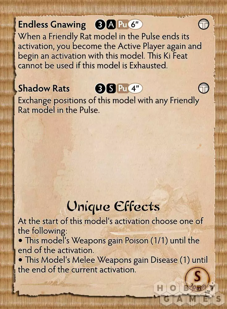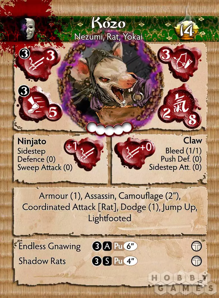 Низкая стоимость этой модели означает, что это хороший персонаж для ближнего боя, ее навыки Ki позволяют удивить ваших противников некоторыми необычными действиями. Endless Gnawing позволит вам неоднократно атаковать вражескую модель, не давая противнику возможности ответить. В сочетании с набором навыков и уникальных эффектов это отличный персонаж для любого начинающего Rat генерала.