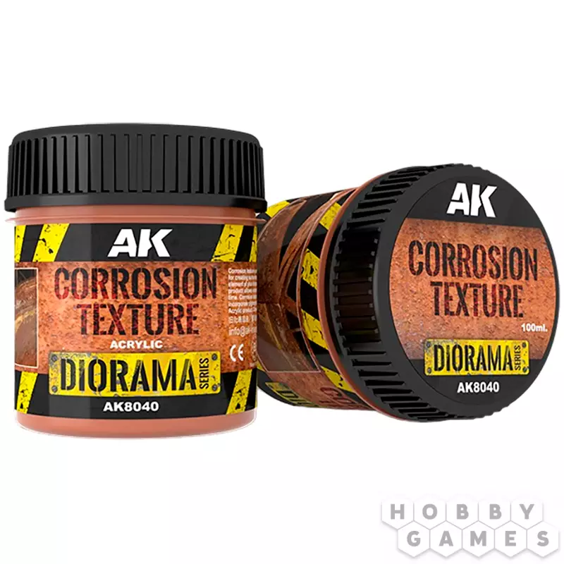 Corrosion Texture от AK Interactive – это акриловая краска, с помощью которой вы сможете придать вашей работе ещё больше реализма. Создавайте коррозийные текстуры "металлических" деталей вашей диорамы. Лучше всего наносить краску тонким слоем, а после высыхания при помощи пигментов придать деталям завершённый вид с помощью различных оттенков ржавчины.
