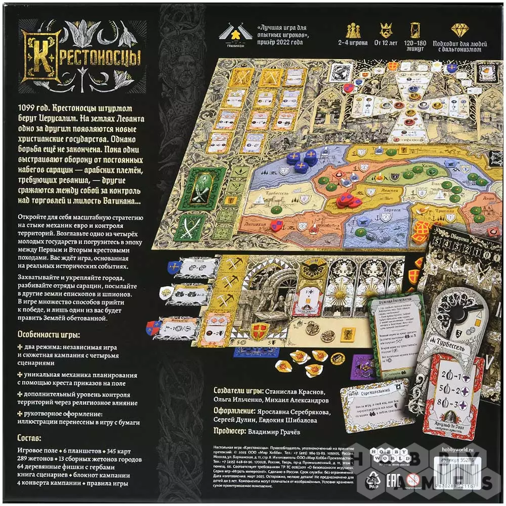 "Крестоносцы" – это масштабная стратегическая игра, сочетающая ареа-контроль и продуманные евро-механики. Действие разворачивается в Леванте – на восточном побережье Средиземного моря – в XII веке, сразу после Первого крестового похода. Это время великих амбиций, кровавых войн и хрупких союзов.