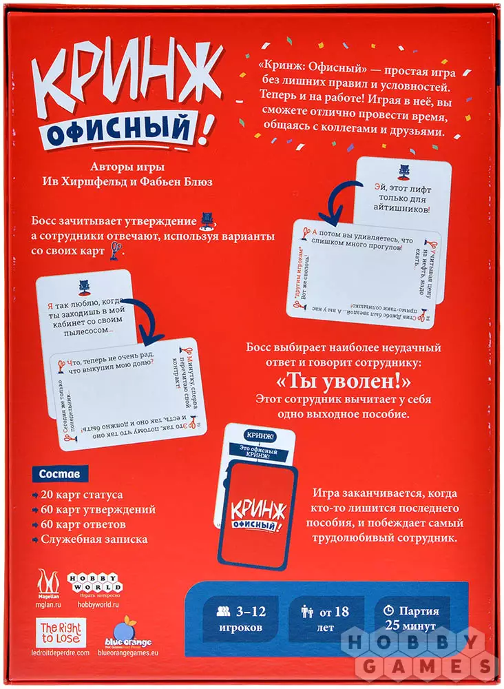 "Кринж: Офисный" – игра с простыми правилами для смелых и неординарных людей, которые не боятся добавить щепотку юмора в рабочую обстановку! Забудьте о скучных совещаниях и бесконечных отчетах – теперь веселье и на работе!