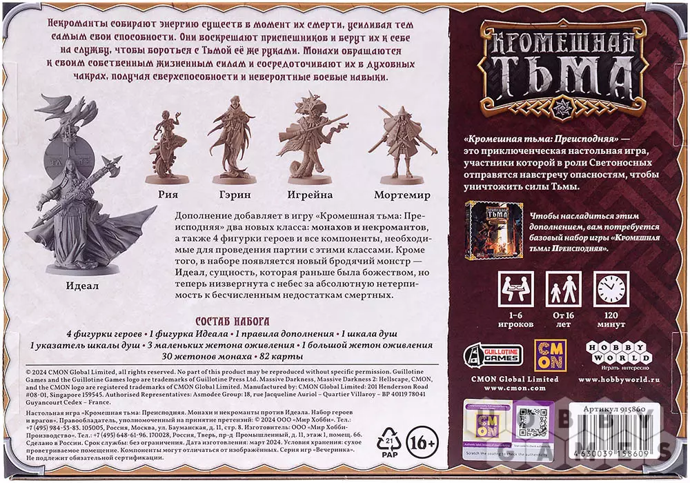 "Монахи и некроманты против Идеала" вводит в игру два новых класса: монахов и некромантов. Каждый из них уникален, и оба класса представлены четырьмя фигурками героев и всеми необходимыми компонентами для захватывающих партий.