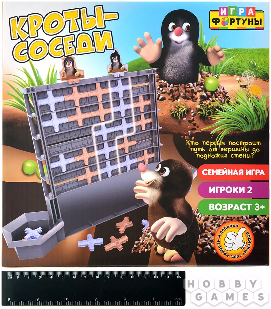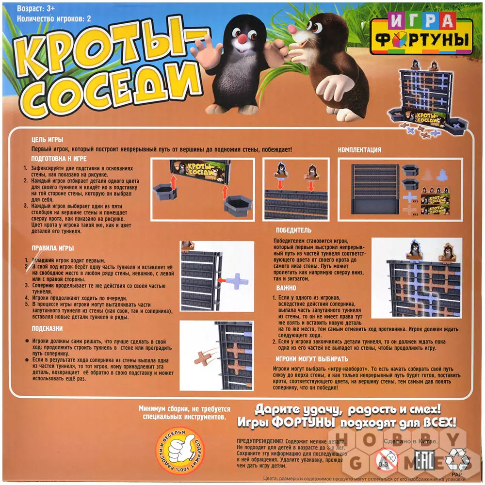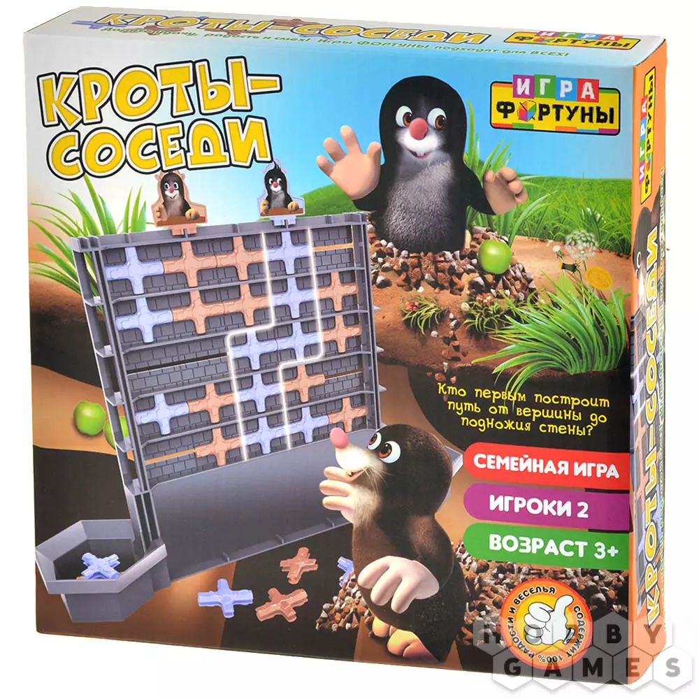 "Кроты-соседи" – это интересная детская настольная игра, в которой для достижения победы нужно быстрее другого игрока построить туннель от основания планшета до его вершины. Оба игрока берут по одному кроту и все детальки туннелей своего цвета, а затем по очереди размещают их в игровое поле с левой или правой стороны. Таким образом можно подвинуть часть туннеля другого игрока или даже вовсе вытолкнуть её с поля! Игроки делают свои ходы по очереди, выставляю по одному фрагменту туннеля, а побеждает тот, кто первым построит непрерывный путь от низа поля до самого верха!