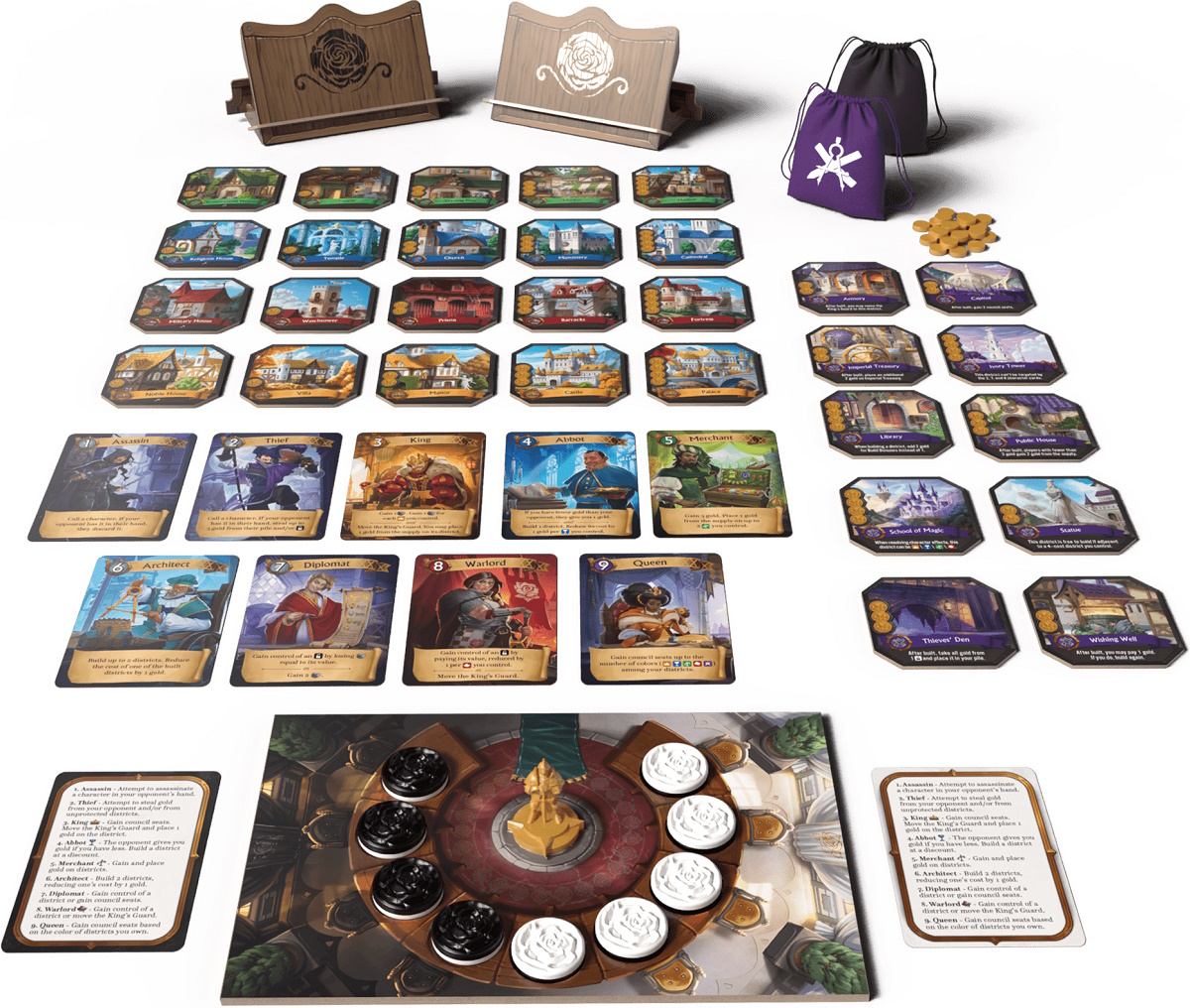 Состав новинки: 25 фишек золота; 2 тканевых мешка; 2 ширмы районов; поле совета; 4 стартовых жетона; 16 базовых жетонов; 10 особых жетонов; фигурка королевской стражи; 9 двусторонних жетонов членов совета; 9 карт персонажей; 2 памятки; правила.