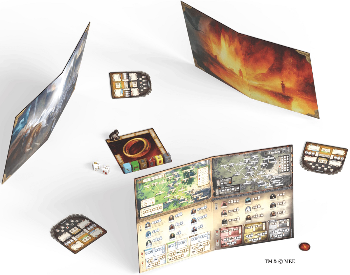 Игра будет продемонстрирована на выставке Gen Con, но состав коробки уже известен: пара кубиков Средиземья; 6 кубиков народов; 4 планшета игроков; 4 планшета битв; 4 маркера; поле Кольца; жетон первого игрока; деревянная фишка Голлума; 4 памятки; правила.