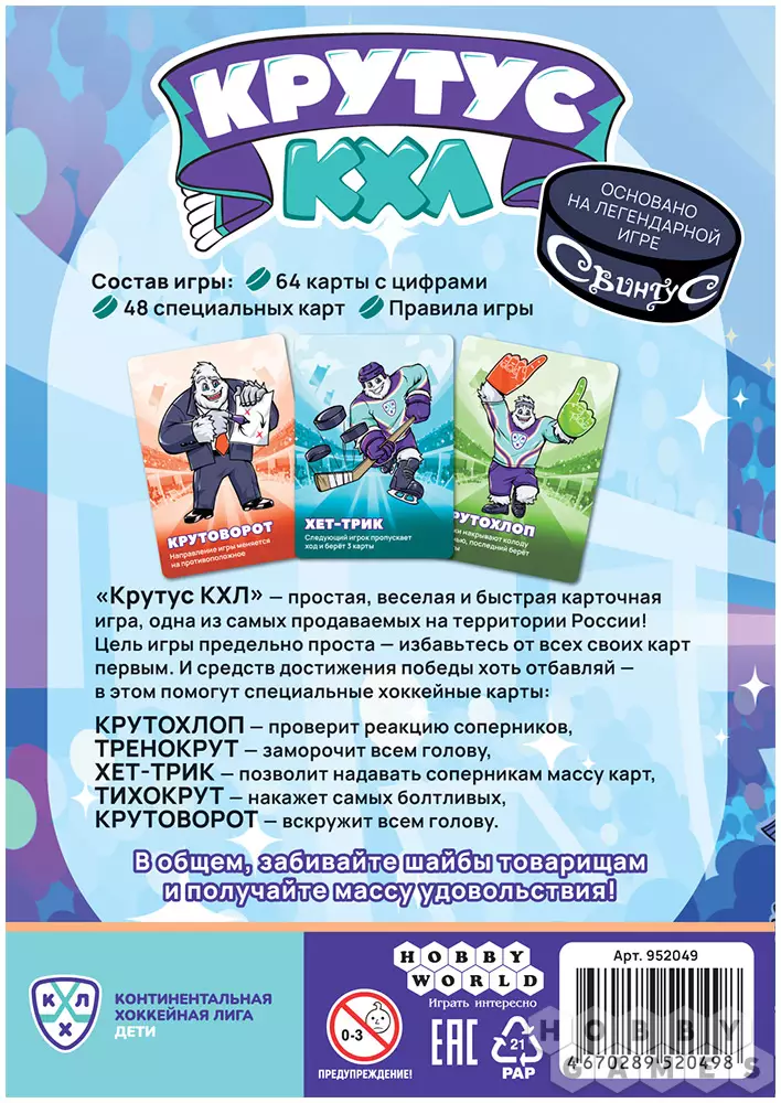 "Крутус КХЛ" – лёгкая и забавная карточная игра от создателей легендарного "Свинтуса", основанная на нём же. Только теперь – в хоккейной тематике! Простые правила, компактность, позволяющая играть в неё где угодно – от дороги домой до самого дома, – и универсальность по возрасту и количеству игроков – иначе говоря, всё то, что нужно для отличного времяпрепровождения! Разомните ручки, приготовьтесь действовать быстро, внимательно и решительно и скорее приступайте к игре!