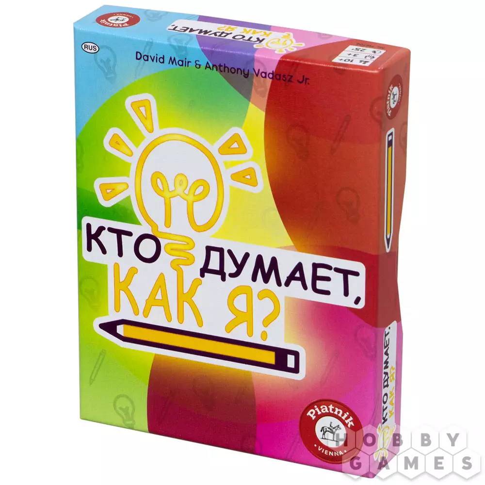 В новой игре от Piatnik "Кто думает, как я?" вам предстоит найти единомышленников, чьи ответы будут совпадать с вашими. По ходу этой ассоциативной игры вы будете участвовать в мозговых штурмах на заранее заданную тематику, но вам придётся думать не только за себя, но и за своего напарника: ваши ответы приведут вас к победе только когда вы будете мыслить одинаково. "Кто думает, как я?" испытает ваш эмоциональный интеллект и умение думать наперёд, и если вы действительно обладаете этими качествами, то используйте их на полную!