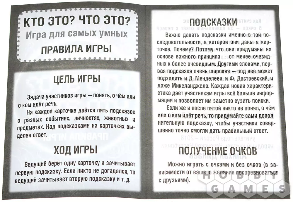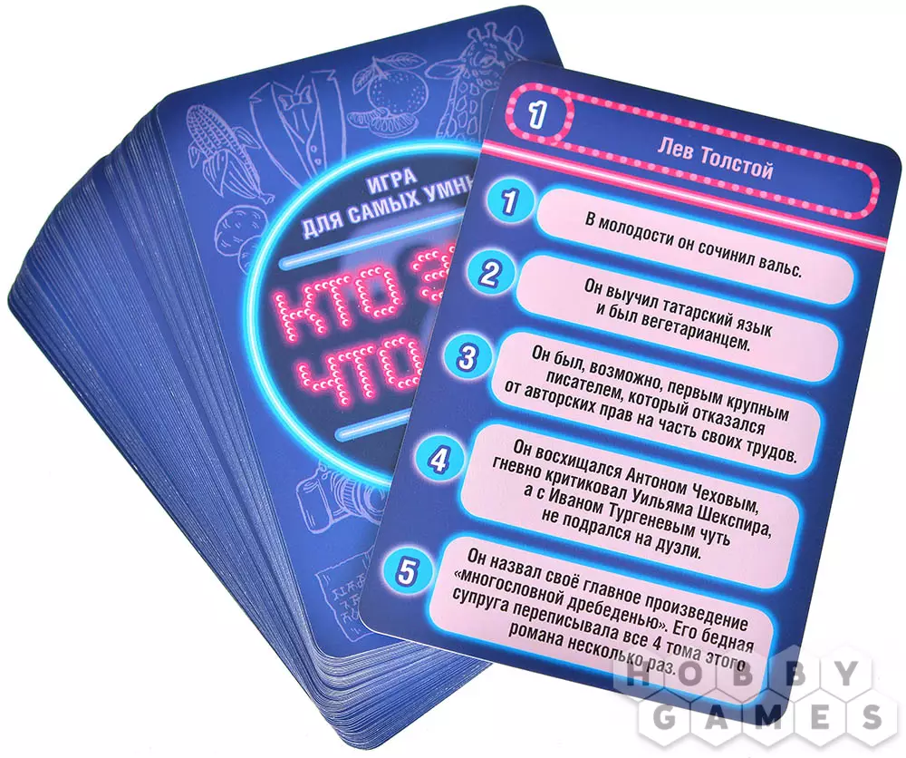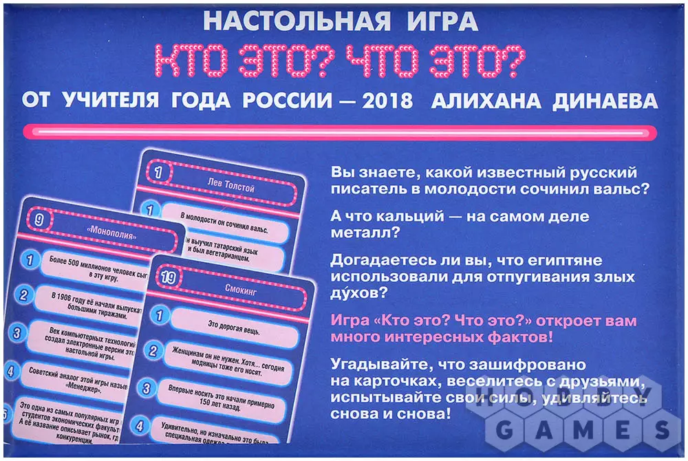 В коробке вас ждут 64 карточки, каждая из которых содержит пять хитрых подсказок. Они могут рассказывать о знаменитых личностях, удивительных животных, важных событиях или самых обычных, но не менее интересных предметах. Задача проста: отгадать загаданное слово быстрее соперников. Но не торопитесь – подсказки раскрываются постепенно, и чем раньше вы догадаетесь, тем больше очков получите!